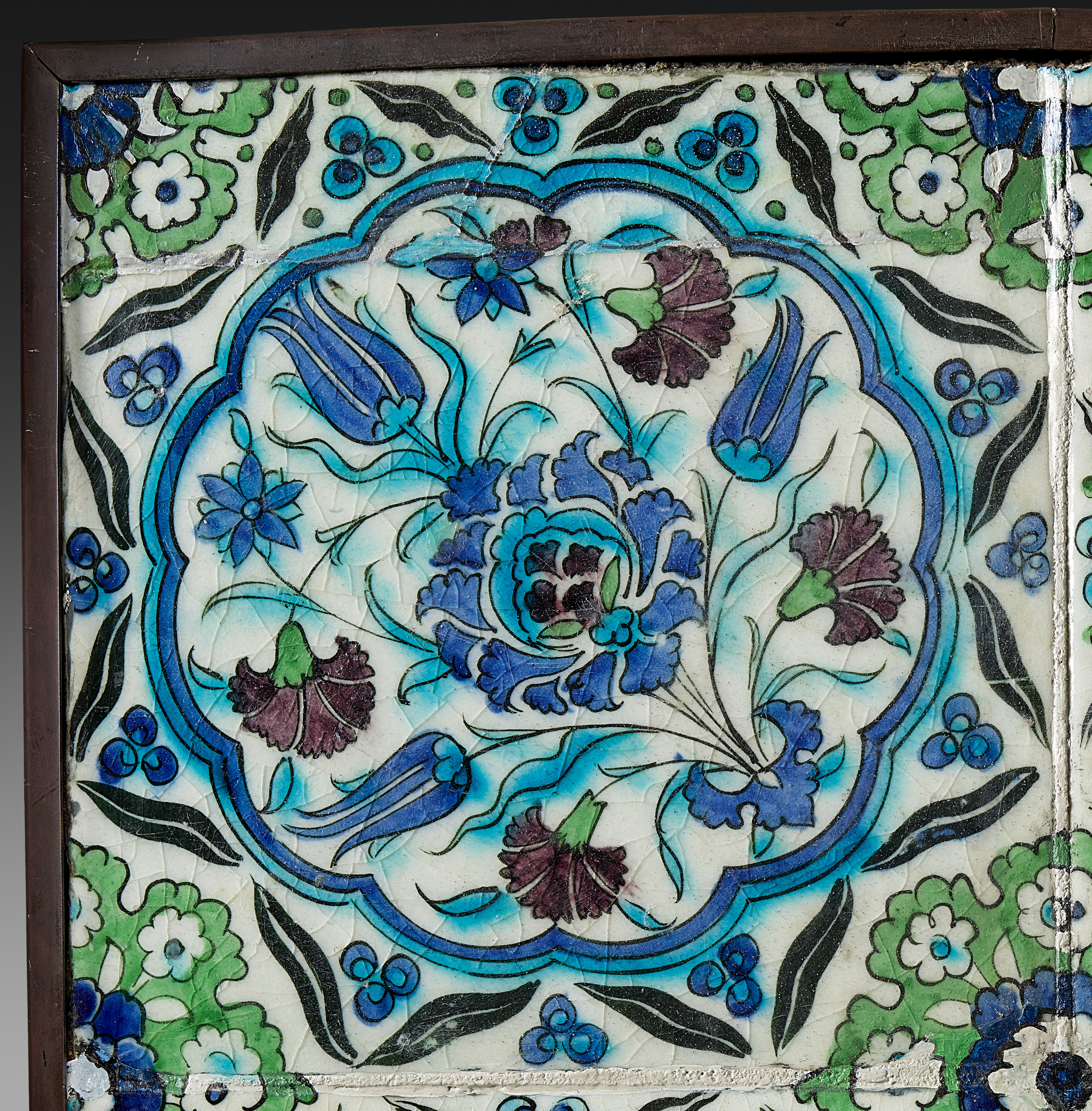 Wall Tile, artist not specified. The tile is square with a dark brown frame. The main body of the tile is white with a large blue floral design in the center. The floral design includes blue, purple, and green flowers with black outlines. The center flower is blue and purple. There are also green leaves and stems throughout the design. The outer edges of the tile have a repeating pattern of small white flowers with blue centers and green leaves. The background of the tile is white. The tile appears to be made of ceramic or porcelain and has a glossy finish. The tile is cracked and worn, with some chipping on the edges.