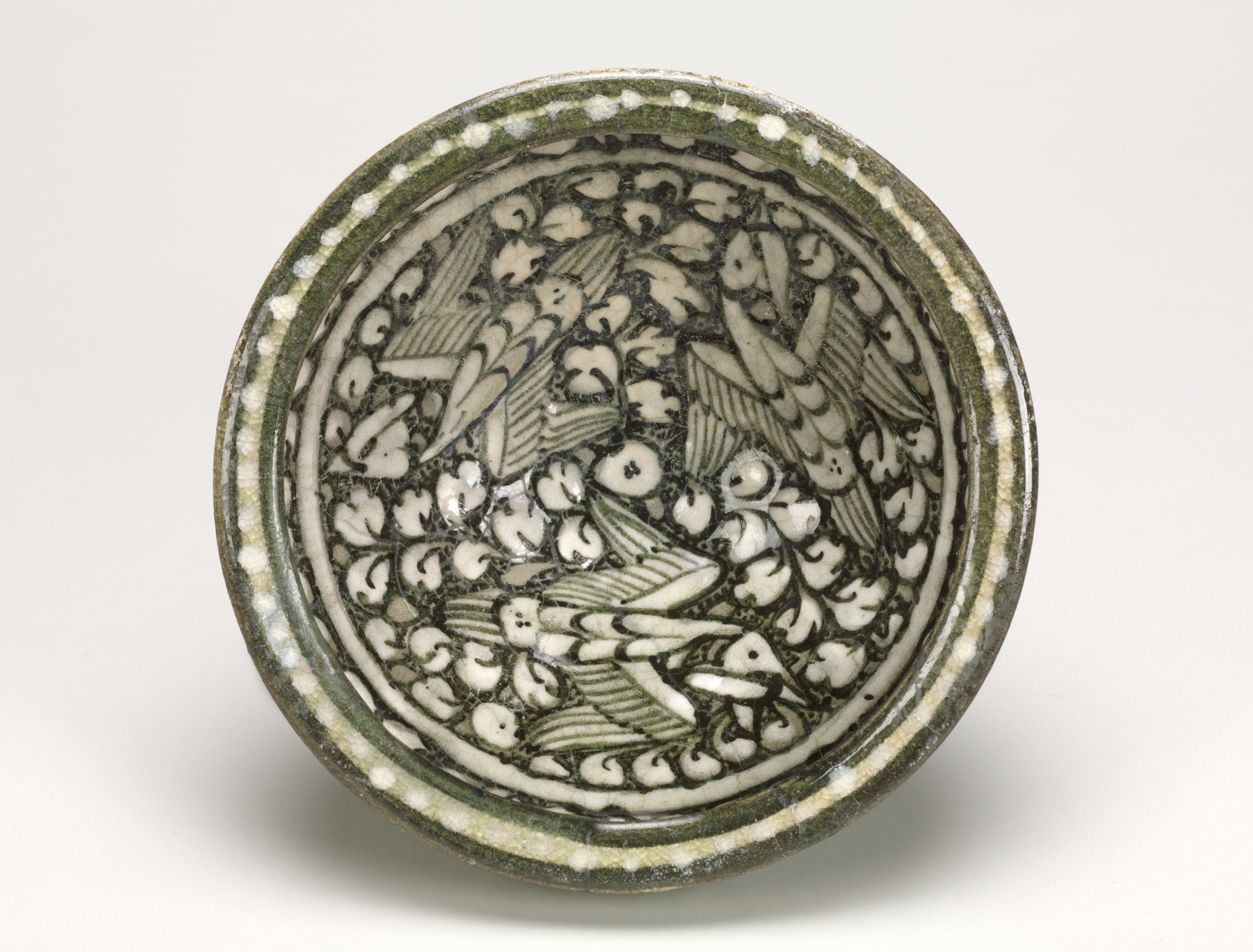 The ceramic bowl, titled "Bowl with Flying Birds," features a rounded shape with a flat bottom and slightly raised rim. The bowl's exterior and interior are covered in a green and white glaze. The interior design depicts multiple birds in flight, rendered in green and white against a white background. The birds are surrounded by foliage and flowers. The rim of the bowl is adorned with a pattern of small white dots on a green background. The bowl's surface exhibits signs of wear, with visible chips and cracks in the glaze. The background of the image is plain white.