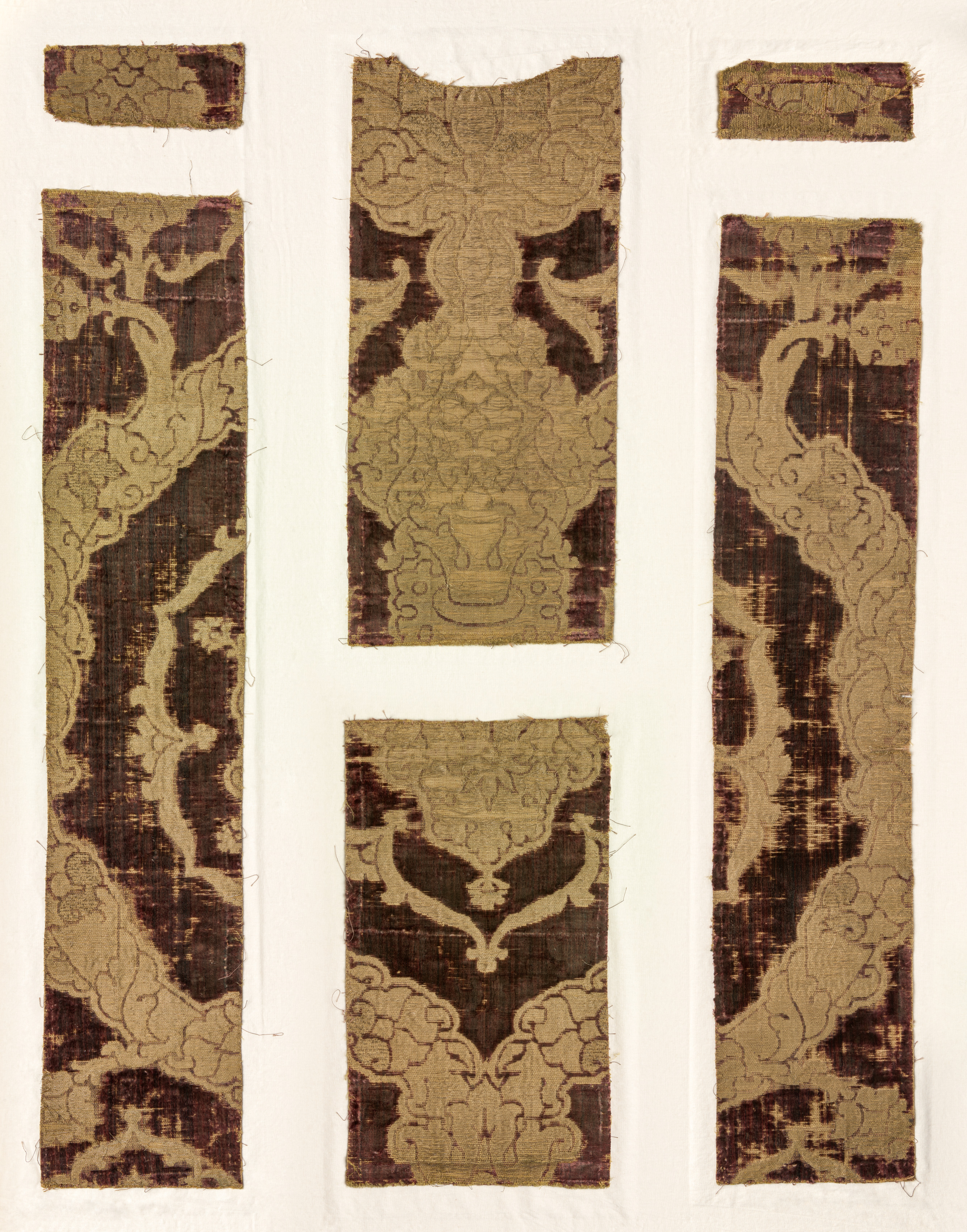 The image shows fragments from a chasuble front, by an unknown artist. The fragments are made of fabric with a brown and gold pattern. The largest piece is in the center, and it has a symmetrical design with a vase or urn at the top, surrounded by curved lines and shapes. There are two long, thin pieces on either side of the center piece, each with a similar pattern. Above the center piece is a small rectangular fragment, and below it is another rectangular fragment. On the far left and right are two long, thin pieces with a similar pattern to the center piece. The background of the image is white. The fragments have rough edges, suggesting they have been cut from a larger piece of fabric. The fabric appears to be old and worn, with visible signs of aging and deterioration. The overall design of the fragments suggests they may be from a liturgical garment, possibly from the 16th or 17th century. The use of gold and brown colors gives the fragments a rich and ornate appearance. The symmetrical design and use of curved lines and shapes suggest a high level of craftsmanship and attention to detail.