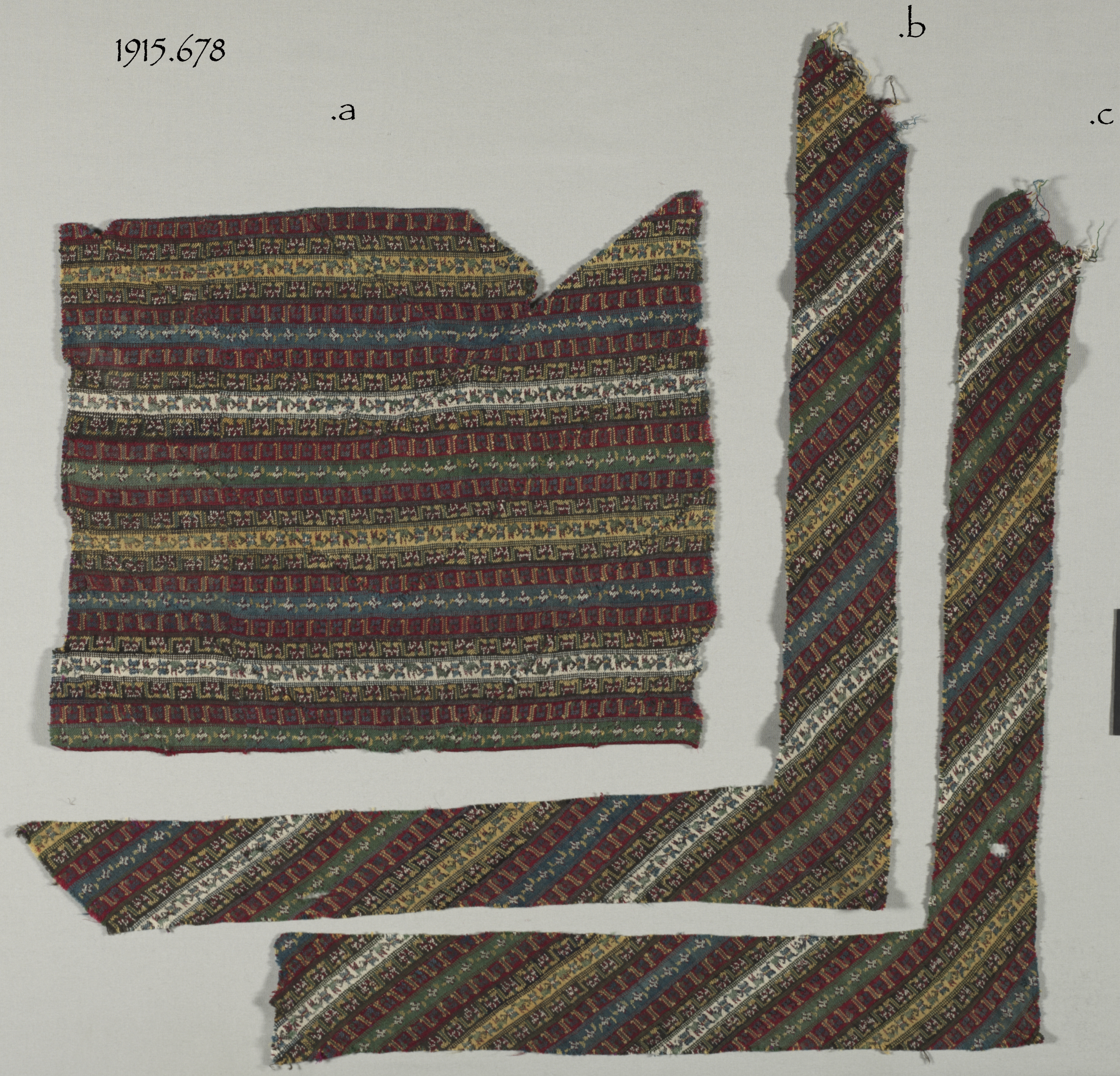 Fragment of a Border of a Shawl by unidentified artist. Three fragments of striped textile, possibly wool or silk. The largest piece, on the left, is square with rough edges and measures approximately 6 inches by 6 inches. The piece has horizontal stripes in shades of maroon, blue, green, yellow, and white. To the right and below this piece are two long, thin strips with diagonal stripes in the same colors. The strips have rough, frayed edges. The background is off-white.