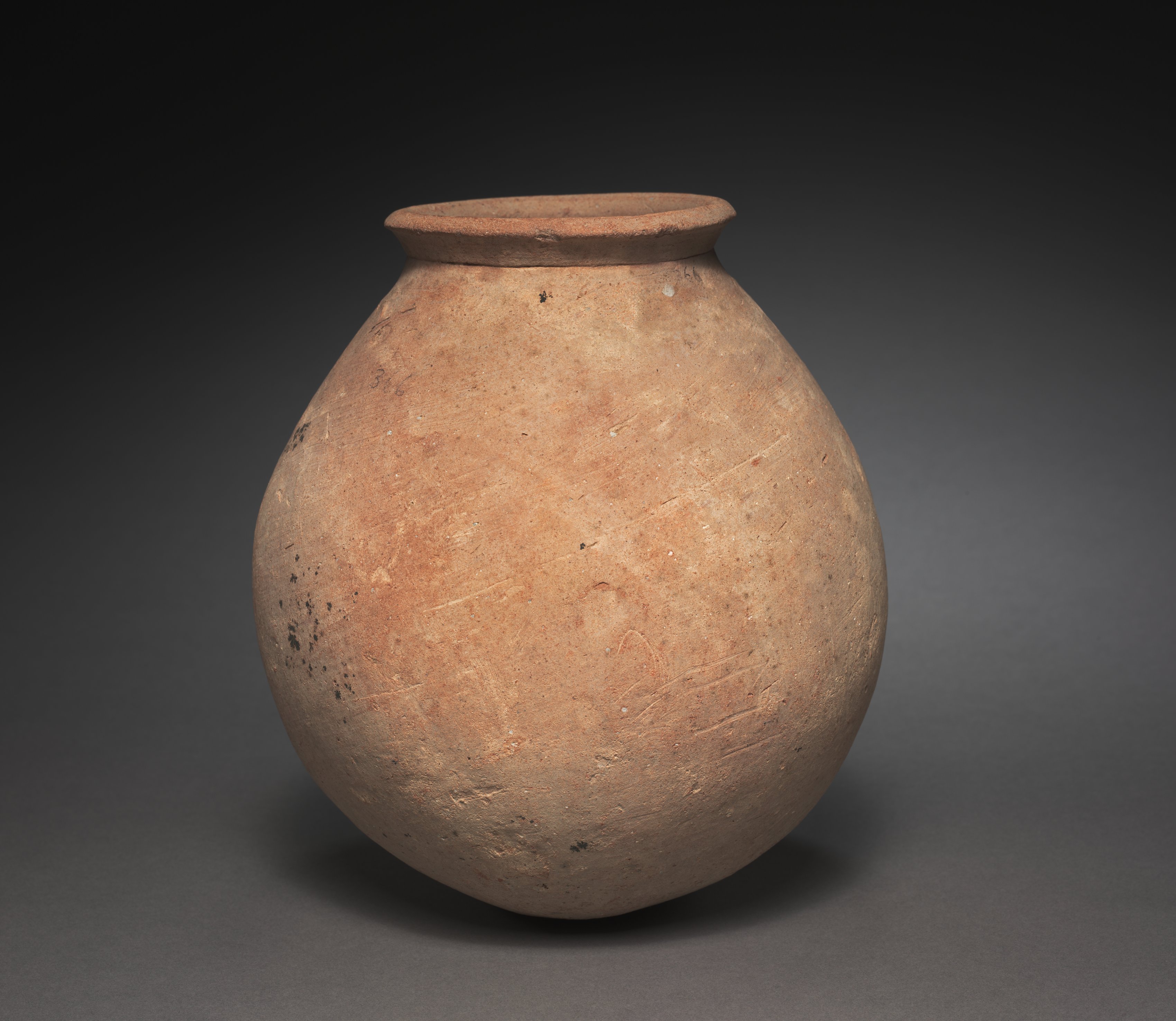 The Water Jar (Globular Jar) by Unknown Artist shows a terracotta-colored clay pot with a bulbous body and a short, narrow neck. The pot is rounded and roughly spherical in shape, with a flat lip at the top. It has a rough, unglazed texture and appears to be made from natural clay. The surface is light brown with darker brown and black spots and marks. The background is dark gray, with the pot casting a shadow on the surface below it.