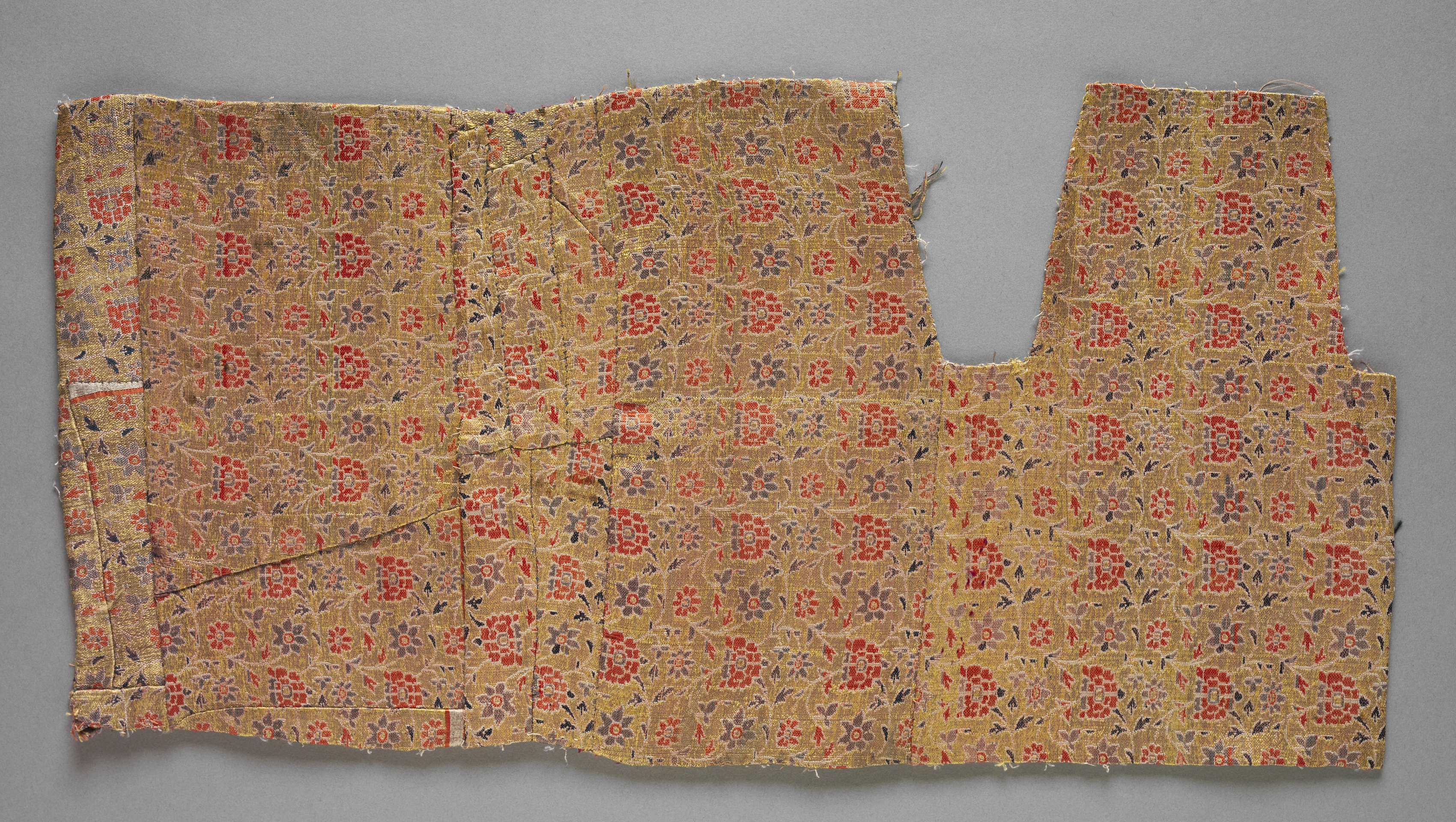Tan-colored fabric with a repeating pattern of red, purple, and pink flowers and leaves. The fabric is torn and frayed at the edges, with a rough, uneven shape. A semi-circular hole is cut out on the right side. The fabric appears to be old and worn, with visible signs of aging and deterioration. Title: Fragments. Artist: Unknown.