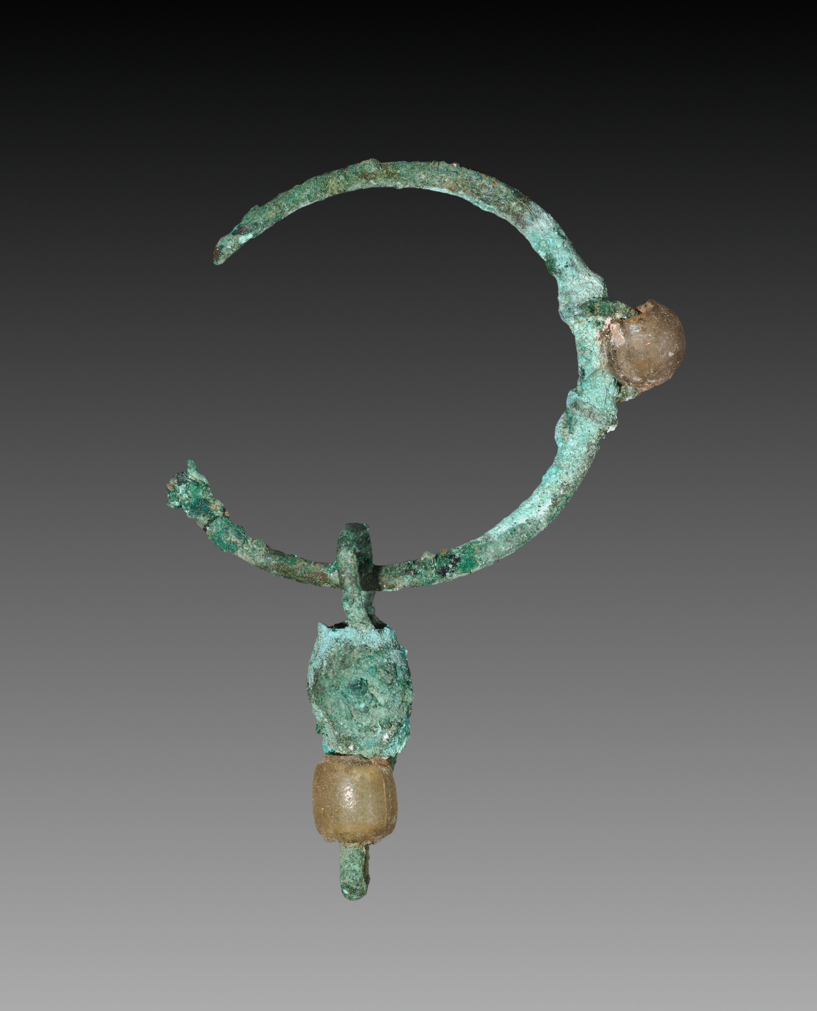 Earring by Unknown, verdigris metal hoop with one end thicker than the other, one end with a clear bead, other end with metal extending into 3 prongs holding a pale yellow bead.