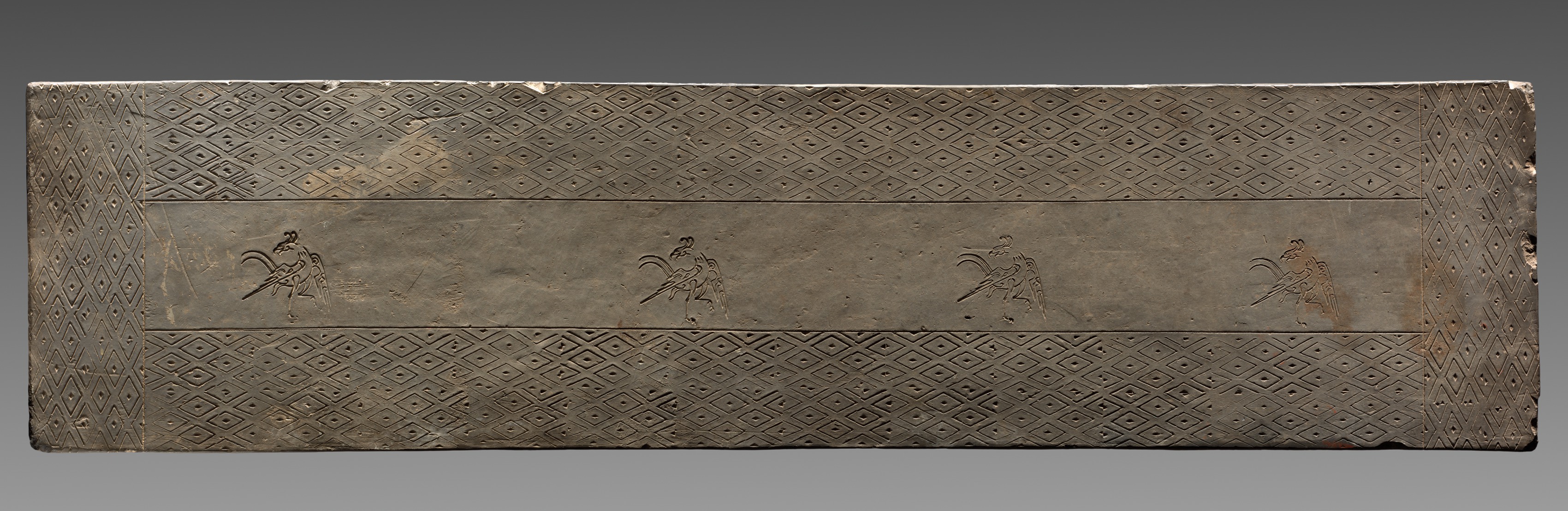 The image shows a rectangular, gray-brown tile with a textured surface. The tile is oriented horizontally. The tile has a border of diamond shapes. Inside the border, the tile is divided into three horizontal sections. The top and bottom sections have a diamond pattern. The middle section contains four identical bird-like figures. Each bird-like figure is facing right. The tile has a darker color at the edges and lighter in the center. The background of the image is gray, with a lighter shade at the bottom. The tile appears to be a "Tomb Tile" by an unknown artist.