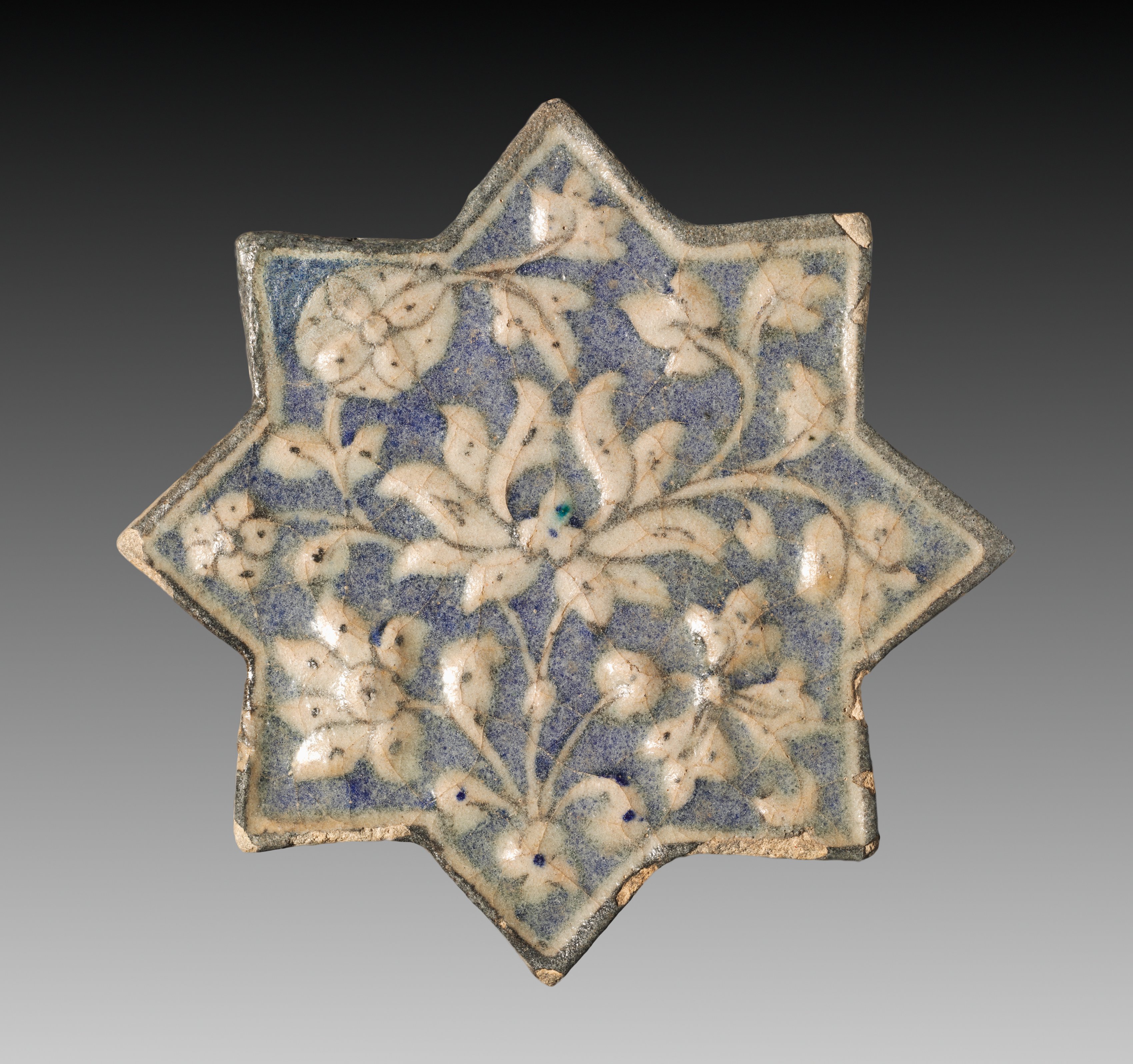 The eight-pointed star-shaped wall tile, "Wall Tile with Lotus Blossom", features a blue background with raised white floral designs. The design consists of a central lotus blossom surrounded by eight leaves and stems. The tile's edges are slightly chipped and worn. The background of the image transitions from black at the top to gray at the bottom.