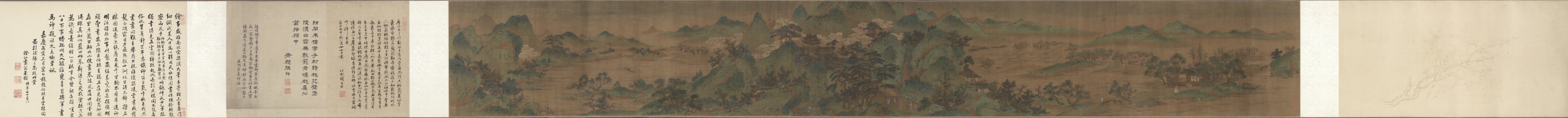 The image depicts a long horizontal scroll painting titled "Landscape, The Palace of the Clouds" by an unknown artist. The painting is divided into sections; on the left and right are two narrow beige sections with black and red writing. The central wide section features a landscape painting with shades of brown, green, and black ink on a beige background. The landscape depicts mountains, hills, and trees. The right section appears to be a lighter beige color with faint pencil writing. The painting appears to be on rice paper or silk and has a traditional Chinese style. The overall color palette is muted with shades of brown, beige, and green dominating the image.