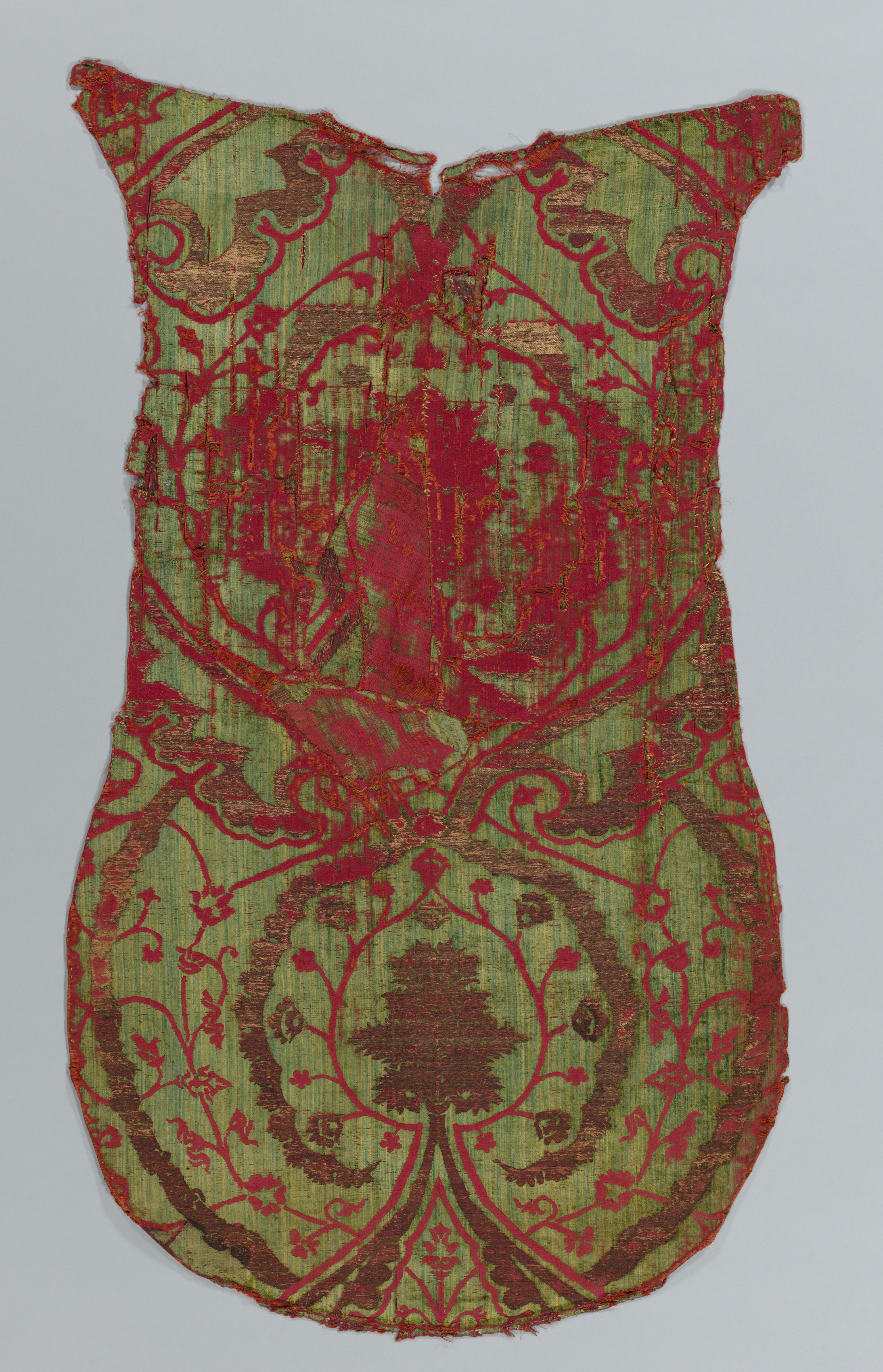 The image shows a green fabric with frayed edges and a red-brown design. The fabric is green with a visible texture and frayed edges all around. The fabric is roughly a rectangle with the bottom rounded; the top has two points on either side. The design on the fabric consists of red outlines and brown fill. The design on the fabric features curved lines and floral patterns. The top half of the design features a central shape outlined in red with brown fills; curved lines and shapes extend from this. The bottom half features a large circular shape outlined in brown with a red floral pattern inside. Curved lines extend from the bottom of the circle to the bottom edge. The background of the image is gray.
