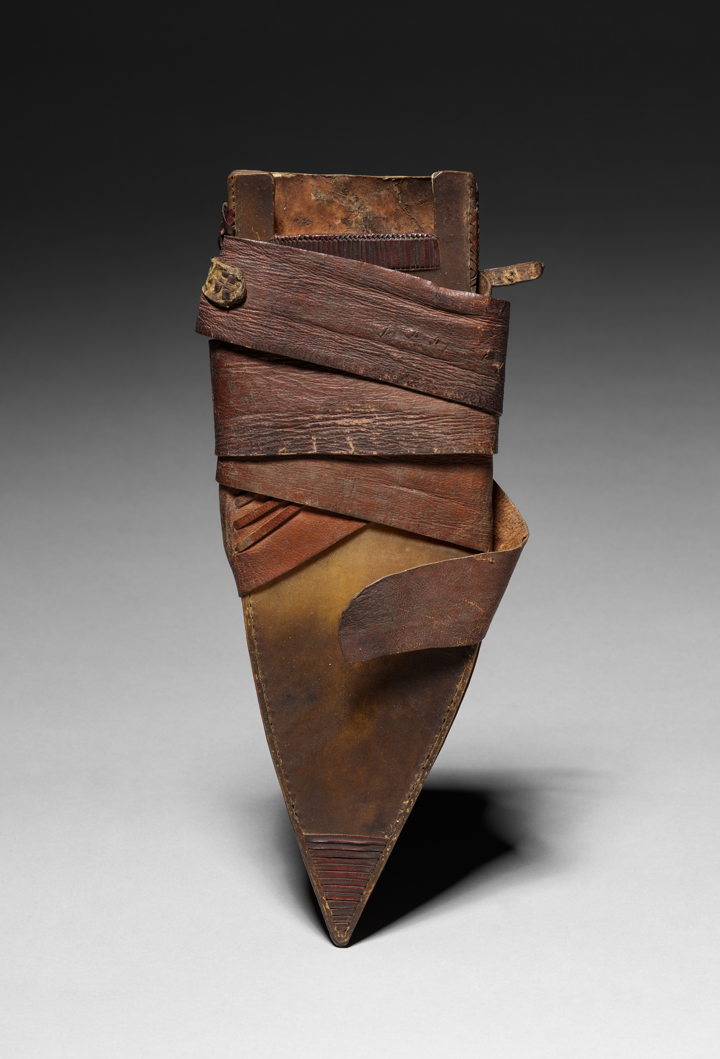 Sheath by Rick Buck. A triangular wooden and leather sheath with a pointed bottom. The sheath is primarily made of dark brown wood and leather strips wrapped around it. The leather appears worn and weathered. A small metal clasp is on the left side. The background is a gradient of black to white.