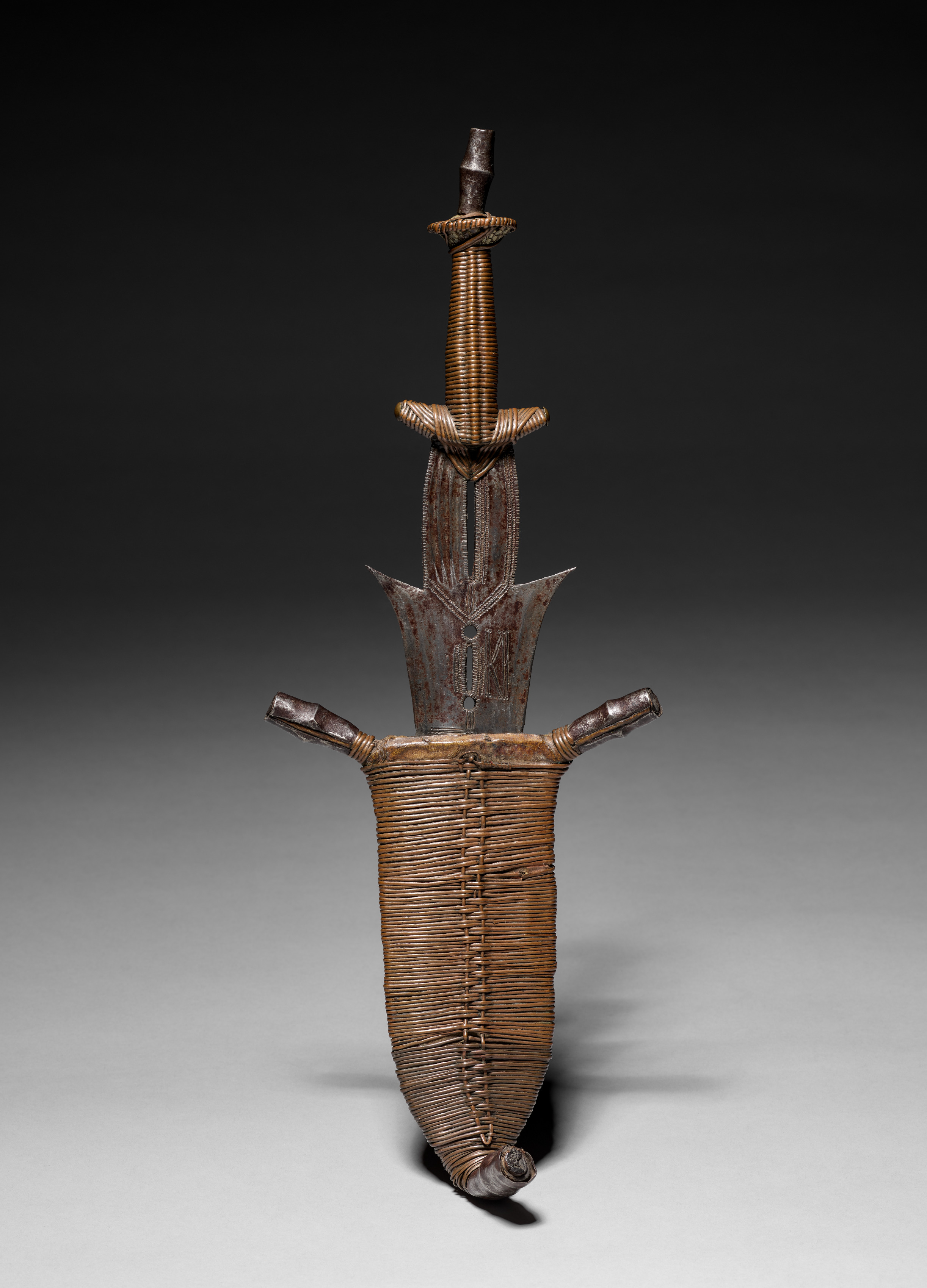 The image shows a knife with a metal blade and a wicker-wrapped handle and sheath. The knife has a long, pointed blade with a short, cross-shaped guard. The blade has a dark patina, with rust spots visible. The handle is wrapped in wicker or cord, and there are two short, pointed protrusions on either side of the handle, just below the guard. The sheath is made of wicker or cord, wrapped around the blade in a spiral pattern, and has a pointed tip. The background is a gradient from black at the top to gray at the bottom. Title: Knife.