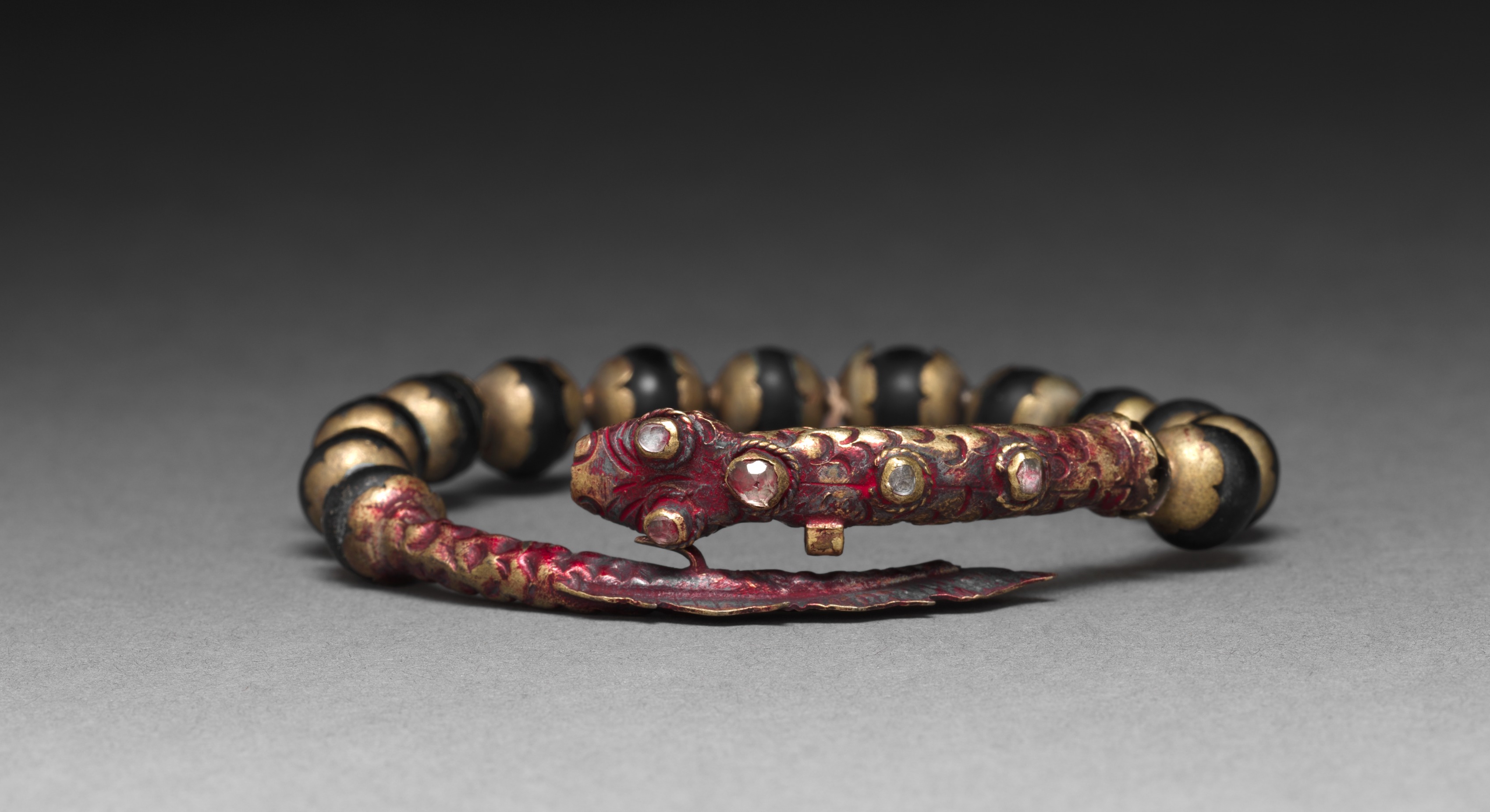 Bracelet by Artist. The bracelet is made of two parts. The main part of the bracelet is a string of beads. The beads are spherical. There are 13 beads total. Three beads are black, and 10 beads are gold. The black beads are interspersed among the gold beads. The second part of the bracelet is a red and gold clasp. The clasp is shaped like an animal head. The animal head has a large snout. The snout curves down. The clasp has four gold studs on the top and two gold studs on the side. The clasp has red and gold details. The bracelet sits on a gray surface. The background is dark gray.