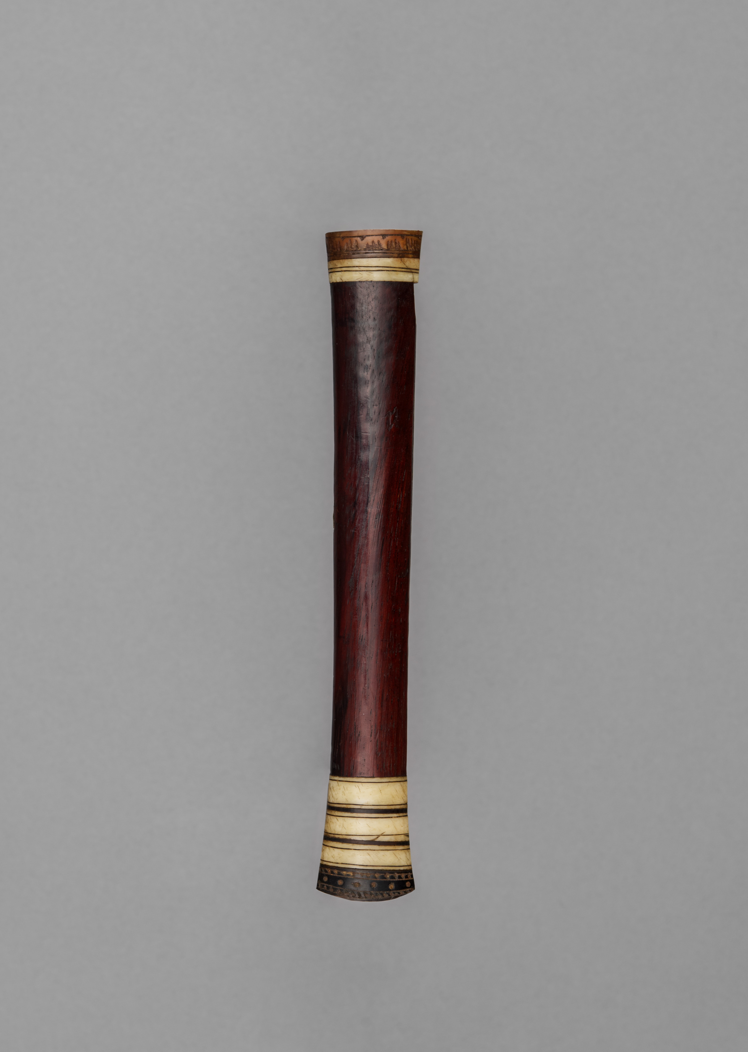 Dark brown scabbard with tapered cylindrical shape, wider at the bottom; gold bands around top and bottom; patterned gold and dark bands at bottom; patterned dark and gold rim at top; plain gray background; by artist Scabbard.
