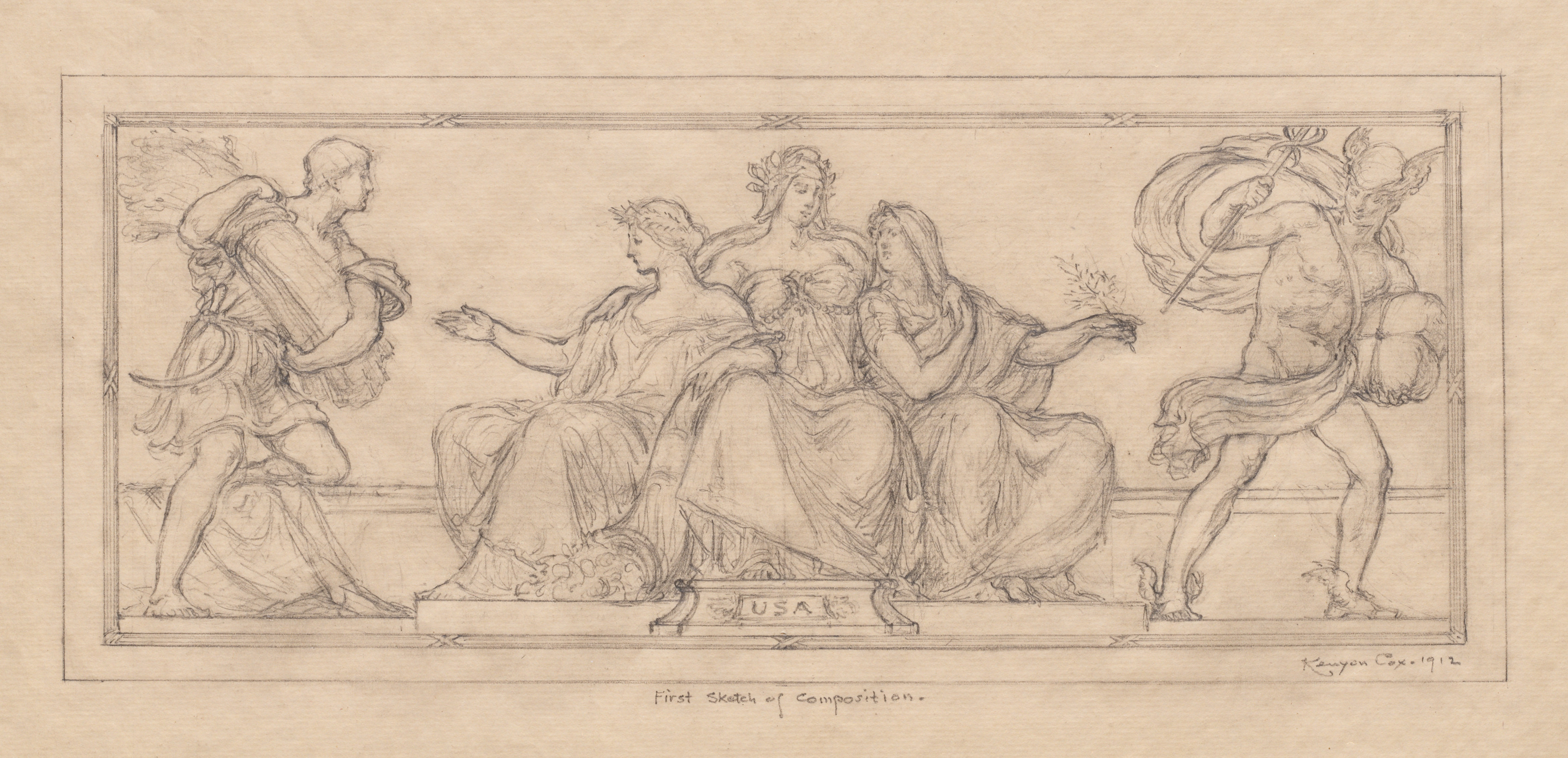 The image depicts a pencil sketch on tan paper, featuring a rectangular drawing with a thin border. Inside the border, there are five human figures. On the left, a man wears a helmet and carries a shield and spear. He faces right, toward three seated women in long dresses. The woman on the left extends her right arm. The central woman wears a crown and holds her right arm across her body. The woman on the right holds flowers in her right hand. On the far right, a nude male figure holds a club and wears a helmet. A block with the letters "USA" is at the center of the bottom. At the bottom of the image, the text reads, "First Sketch of Composition." The artist's signature appears in the lower right corner.