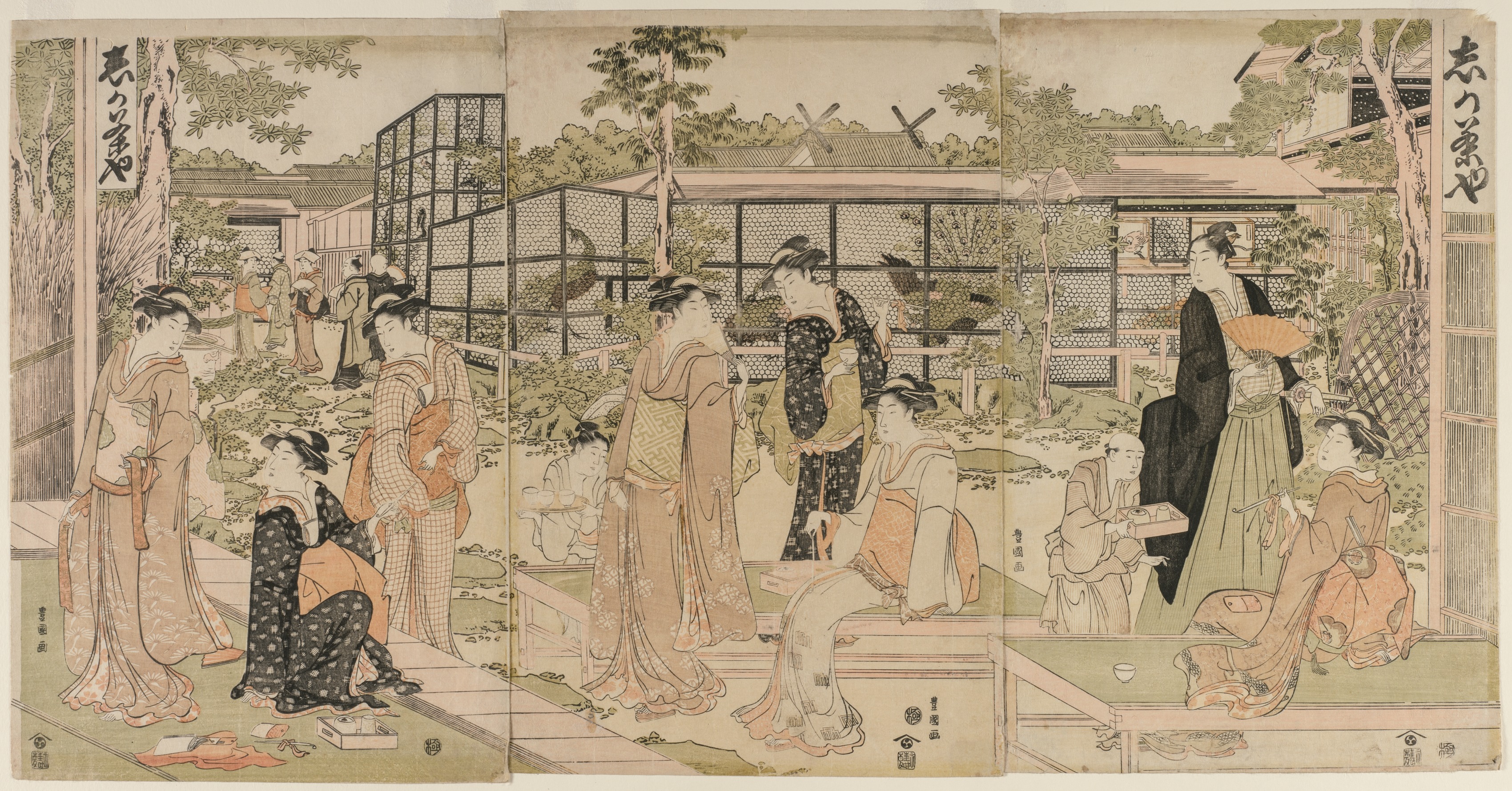The Shika Teahouse by Utagawa Toyokuni depicts a group of women in traditional Japanese clothing. The scene shows thirteen women in total; most are wearing kimonos and some are wearing headpieces. The women are standing or sitting on platforms outdoors; some are on the left side of the image, others are on the right. The platform on the left side of the image has a tree trunk on the left edge; the platform on the right side appears to have a railing. Some women are interacting with each other; a woman near the right edge holds a tray. In the background, there are trees, a building and several structures made of wood and wire mesh. A fence separates the background from the foreground. The color palette is muted with shades of beige, brown, green and black. The image appears to be a traditional Japanese woodblock print. The composition spans two panels. The scene appears to be set in a garden outdoors.