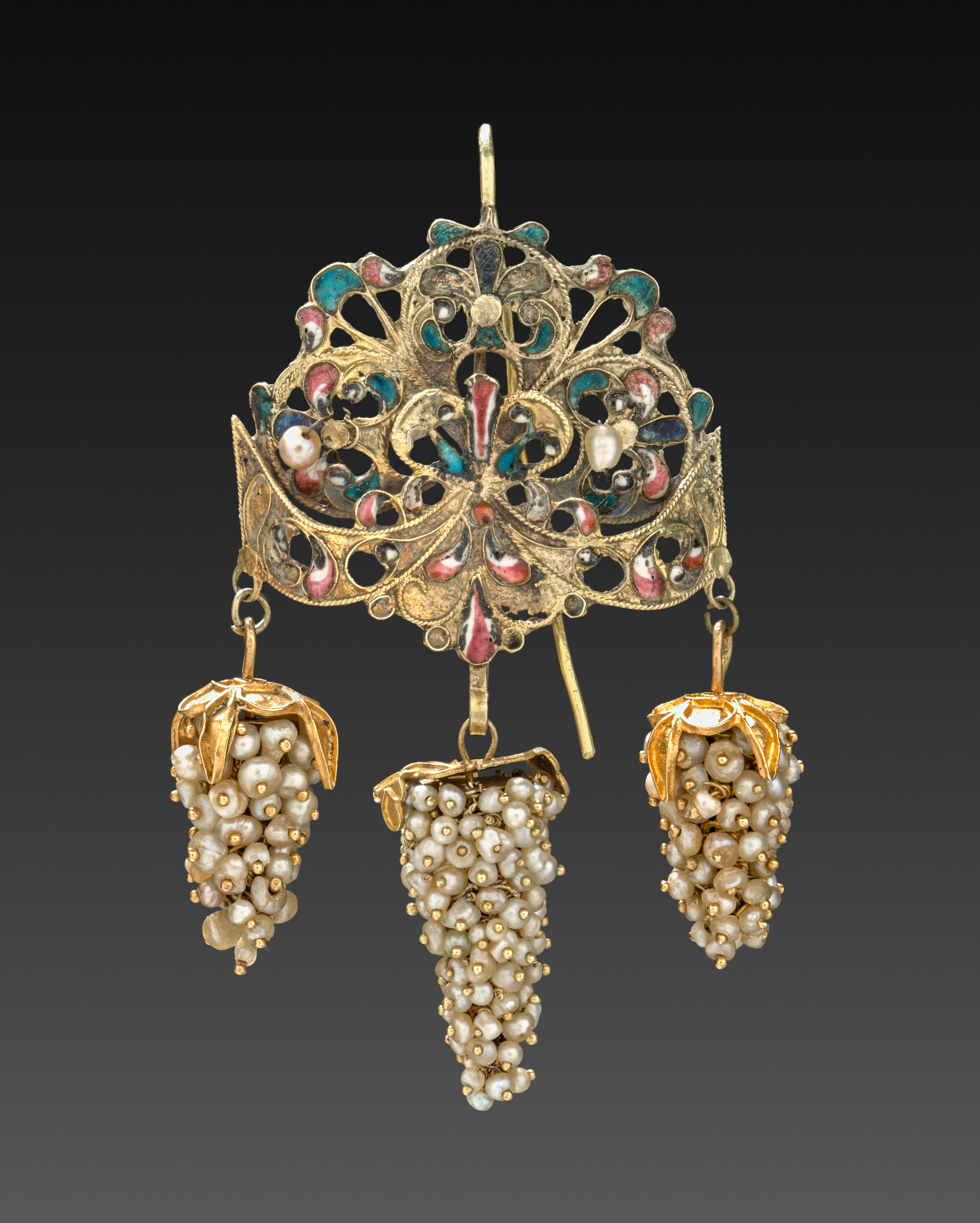 Gold earring with a filigree design, featuring a floral pattern with enamel details in blue, green, and pink. The earring has a circular top with a post at the top for attachment. Three clusters of pearls are suspended from the bottom, each resembling a bunch of grapes with gold leaves at the top. The background is dark grey to black. Earring by Peter Carl Fabergé.
