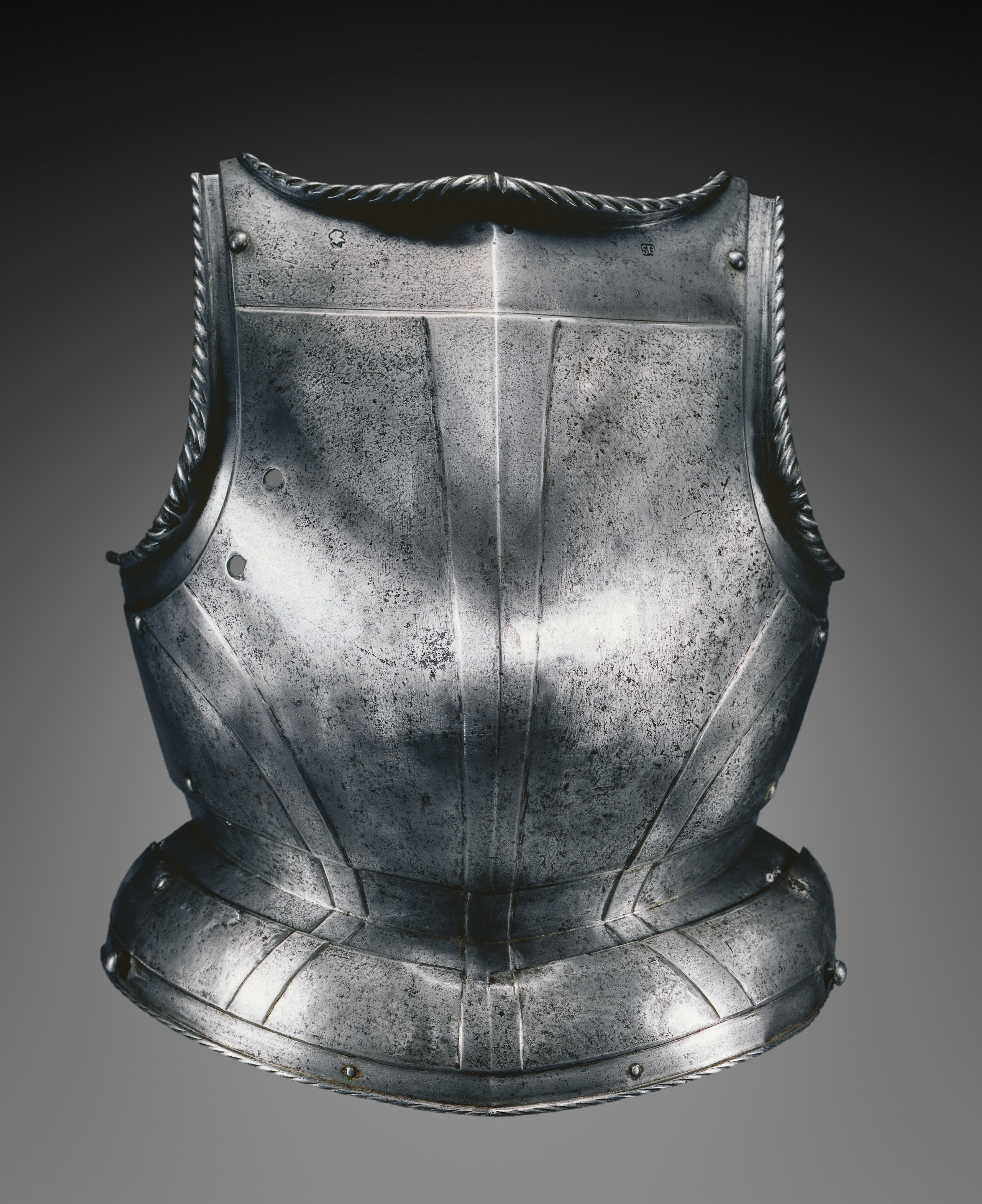 The Breastplate by Hans Stopler, features a curved, silver-colored metal piece with a wide base that tapers upwards. The surface appears weathered with visible signs of wear. A decorative rope-like design adorns the top edge on both sides, and small rivets are visible along the edges and center. The piece has a central vertical ridge flanked by symmetrical curved sections. The background transitions from dark to light gray.