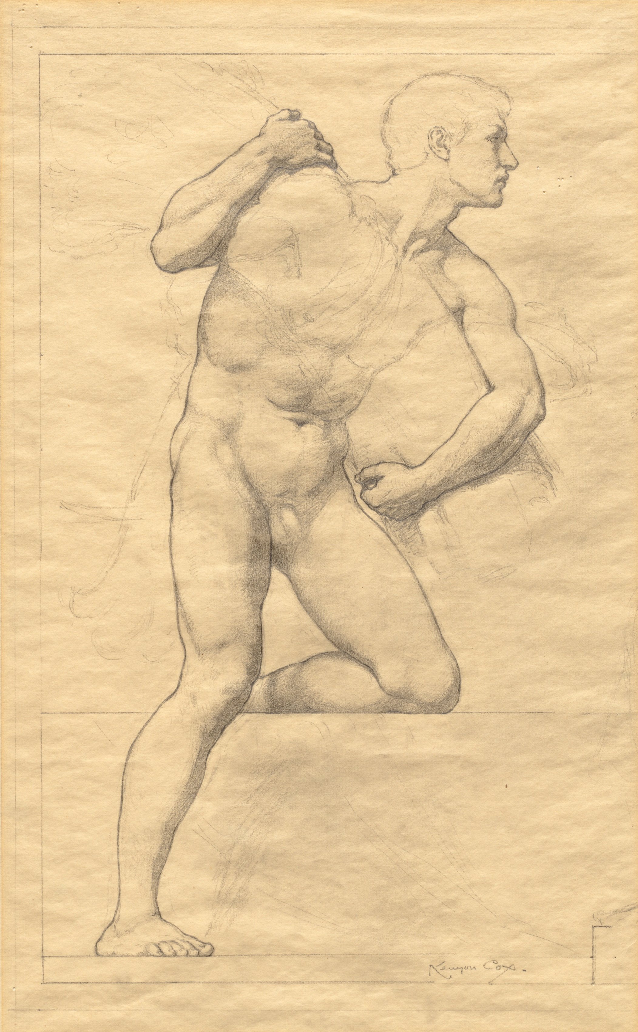 The drawing depicts a nude male figure in a dynamic pose. The figure is standing on one leg with the other bent behind him. His right hand is raised to his shoulder, while his left hand is positioned near his abdomen. The figure's body is rendered in a realistic style, showcasing detailed muscles. The drawing is signed at the bottom. The background of the drawing is a light brown color with some pencil marks and a thin border around the edge. The overall composition presents a study of the human form. Sketch by Kenyon Cox.