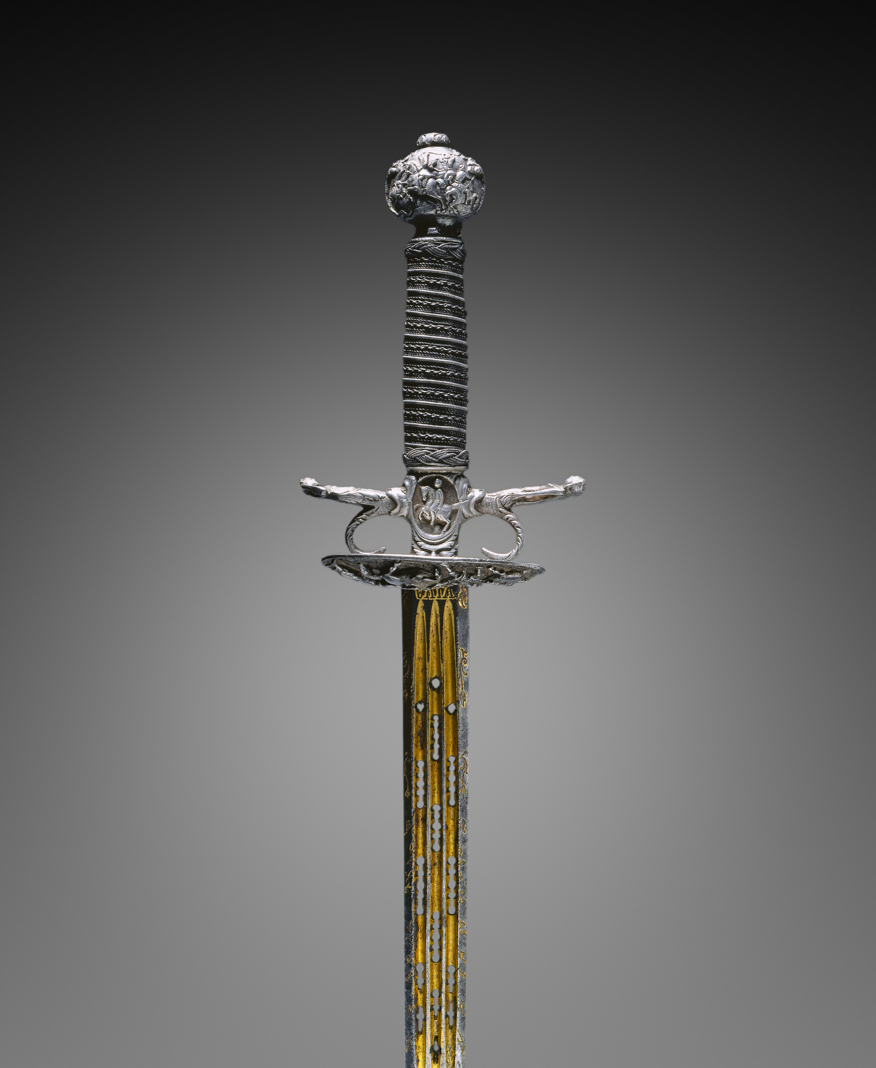 Small Sword by Giovanni Battista Ferrucci. The sword has a silver pommel that is spherical and ornately decorated. The grip is wrapped in thin silver wire. The crossguard is silver with a flat, wide quillon with a slight curve towards the blade. The quillon ends are decorative and have a slight upturn. The blade is long, narrow, and flat with yellow and silver etchings running longitudinally along it. The background is a gradient from dark gray at the top to light gray at the bottom.