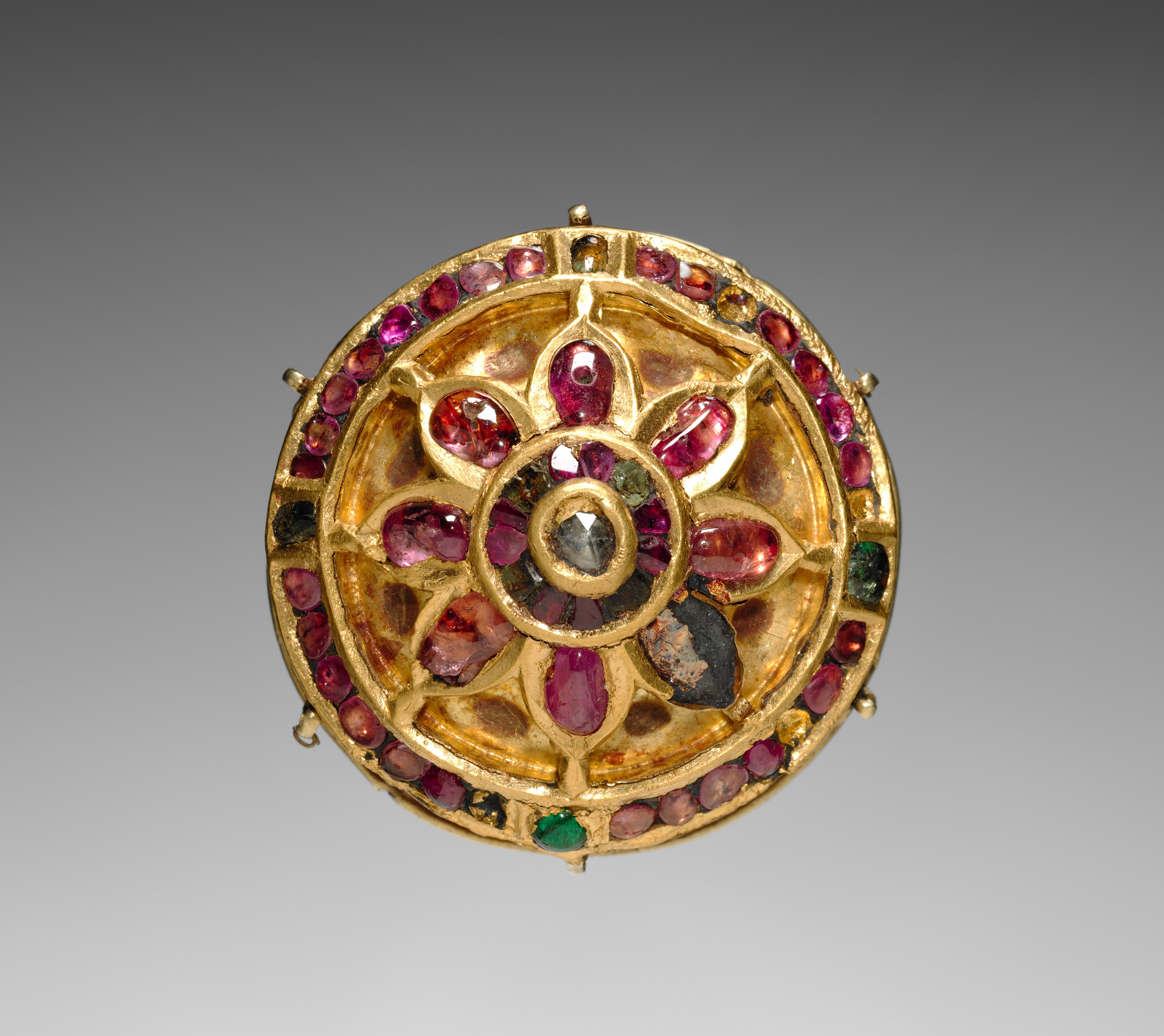 Round gold brooch featuring a flower-like design with a central spiral motif. The center contains a large, dark stone surrounded by pink and black stones, arranged in a spiral pattern. The spiral is encircled by a flower-like design with eight petals, each containing a pink stone. The outer edge of the brooch is adorned with small, round pink stones. A few green stones are interspersed among the pink stones on the outer edge. The brooch has a textured, rough appearance and small gold balls at the top, bottom, left, and right. The background is gray. Ear Plug by Kurt Schwitters.
