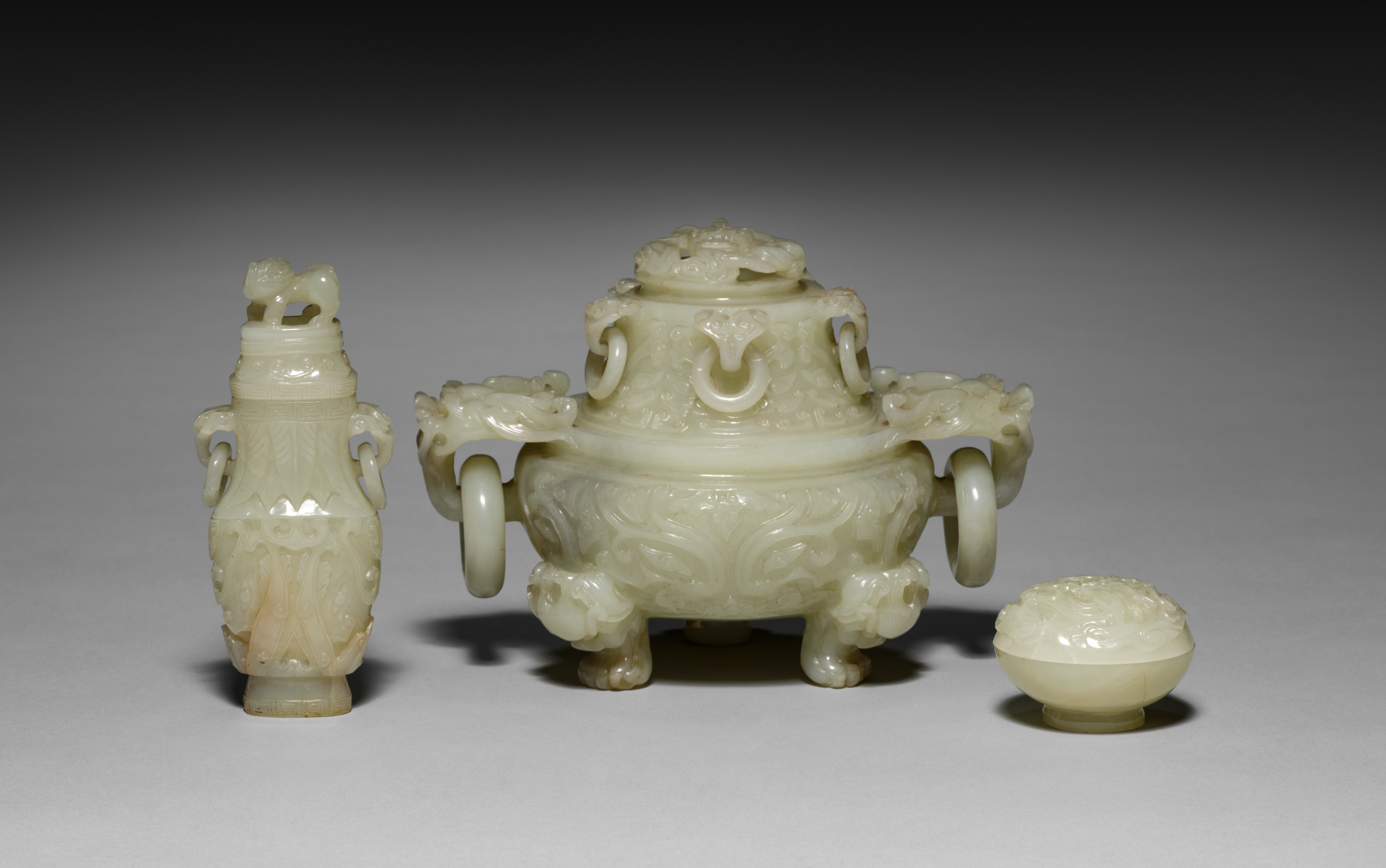 The image shows a Chinese Jade Incense Set by an unknown artist. The set consists of three pieces. The piece on the left is a tall, narrow vase with a handle on each side and a small animal on top. The vase is carved with a design and has a small base. The middle piece is a large, round container with a lid and three legs. It has two handles on either side and a small animal on top. The container is carved with a design. The piece on the right is a small, round bowl with a carved top. All three pieces are made of pale green jade and have a glossy finish. The background is gray, with shadows cast by the pieces.