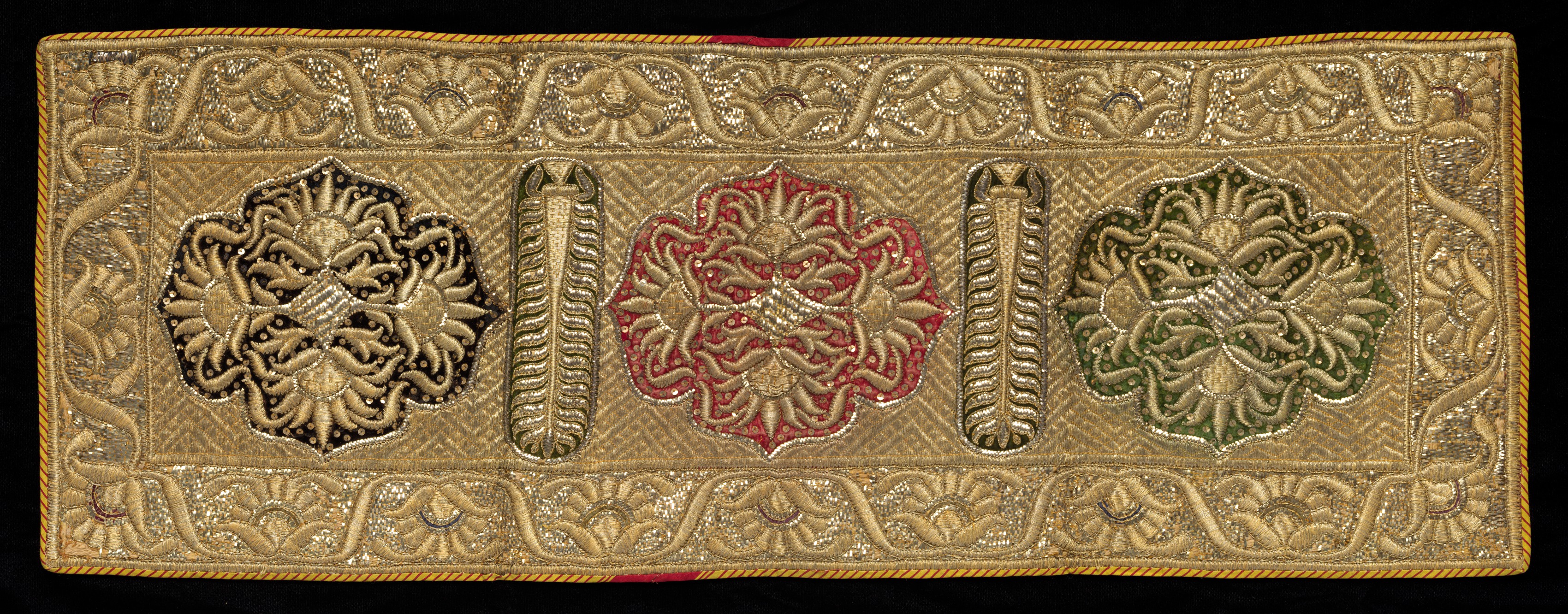 The image shows a rectangular piece of embroidered fabric with a gold background. The fabric by artist titled "Embroidered Strip" features a thick gold rope-like border around the edges. The main body of the fabric has a repeating pattern of various shapes and designs. There are three large, flower-like shapes in a row down the center, each with a different color background: black, red, and green. These shapes are surrounded by intricate gold embroidery. Between the flower-like shapes are long, thin, feather-like designs. The entire fabric is densely embroidered with gold thread, featuring floral patterns and other designs throughout. The background of the image is solid black.