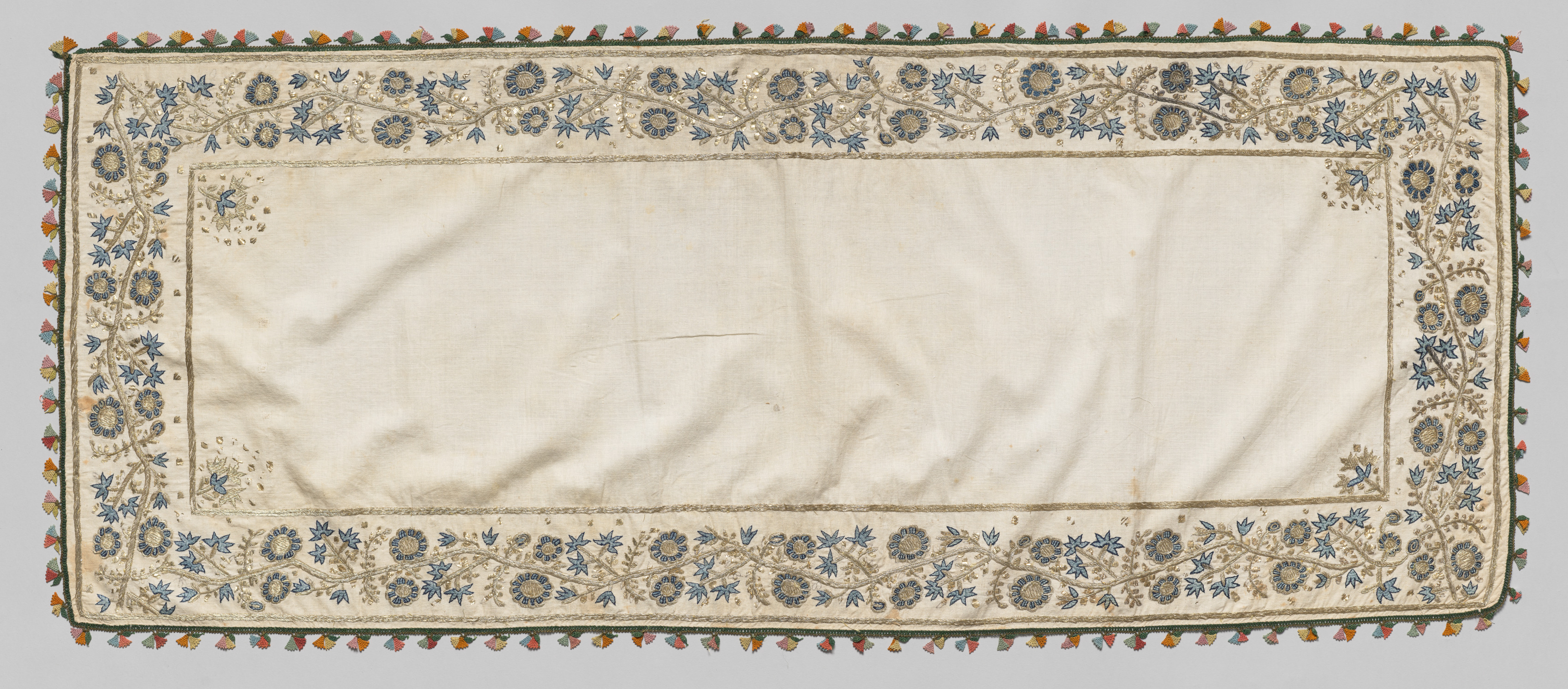 Rectangular textile with a cream-colored center, blue and gold floral patterned border, and multicolored tassels along the edges. The border features a repeating design of flowers and leaves in blue and gold thread. The textile has a subtle sheen and appears to be made of a smooth fabric, possibly silk or cotton. The background of the image is light gray.