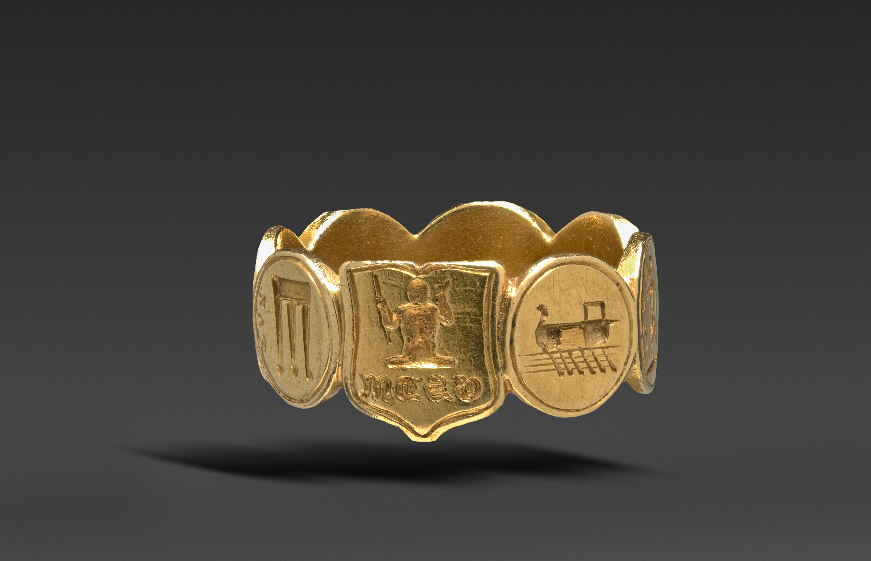 Gold ring with three panels. The left panel is vertical rectangle divided into three sections. The center panel has a shield shape with a figure holding up a weapon. The right panel is circular with an image of a machine on a grid. The background is dark gray.