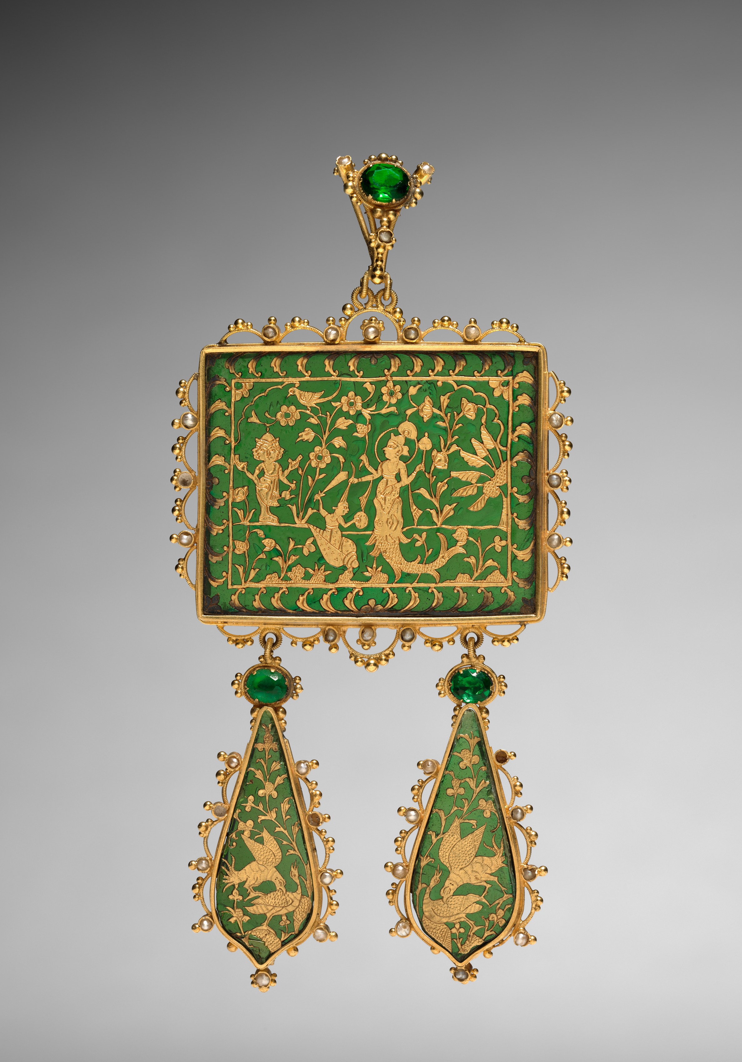 Green and gold pendant with a rectangular top section, adorned with a gold floral pattern on a green background, depicting two figures. The top features a small green gemstone. Two teardrop-shaped green and gold sections hang below, each with a green gemstone above and surrounded by gold filigree embellished with small white gems.