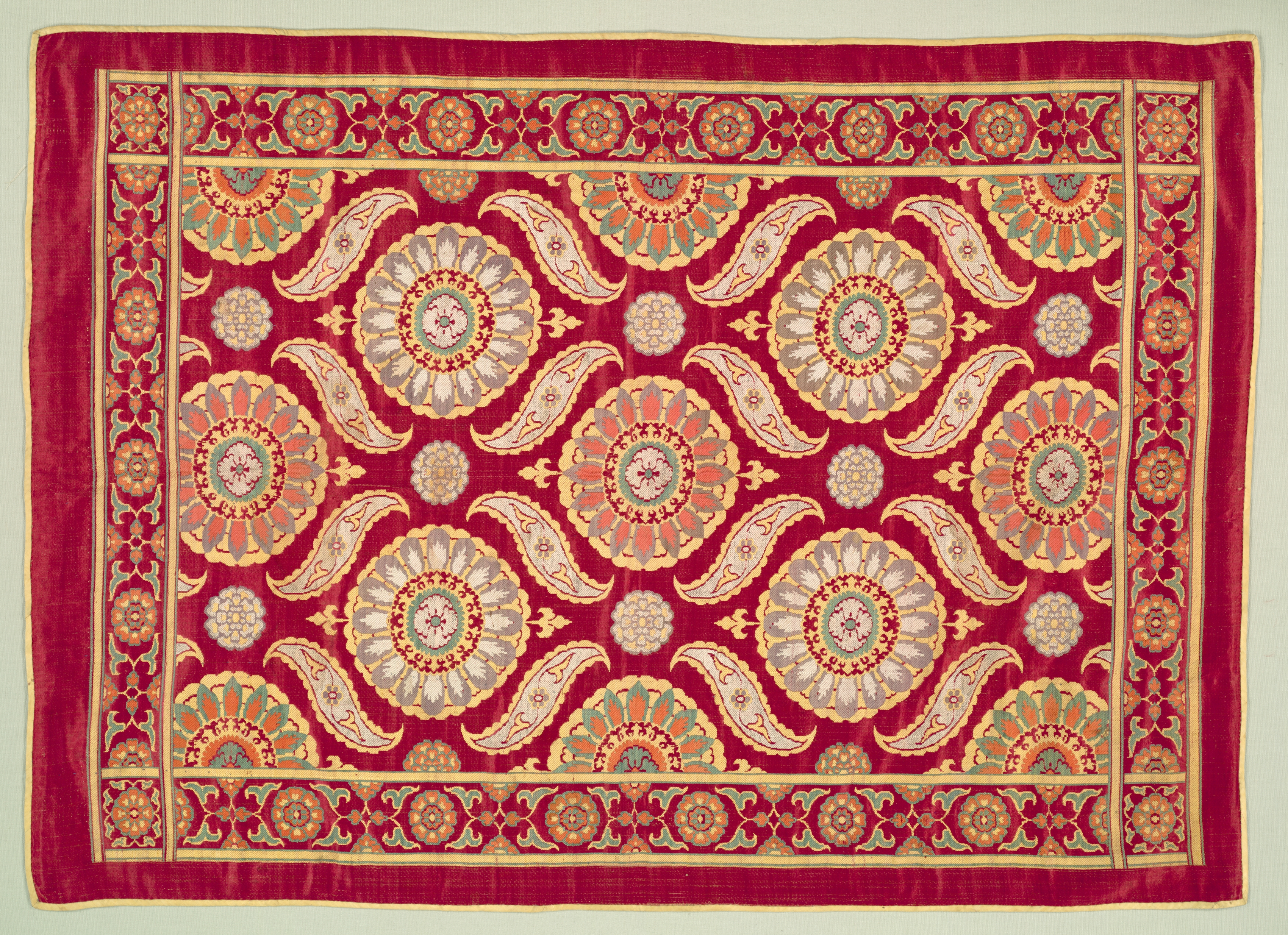 Red fabric with a paisley and floral patterned design. The fabric features a red background with a repeating pattern of large floral motifs in shades of red, orange, gray, and green. The floral motifs are surrounded by paisley shapes and smaller flowers. A border of similar design runs along the edges of the fabric. The title of the piece is "Cover" and it is by an unknown artist.