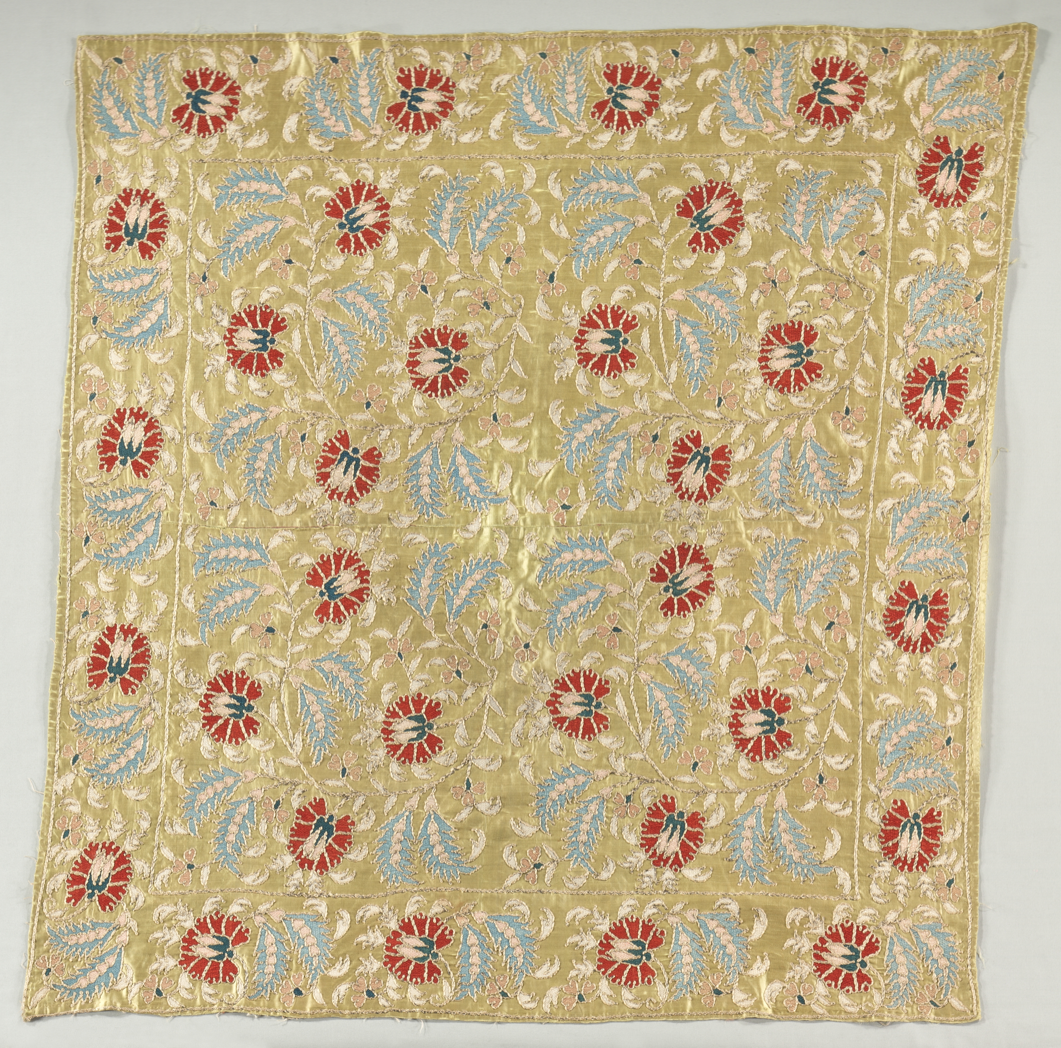 The Embroidered Cover by an unknown artist features a square piece of fabric with a gold background. The fabric has a repeating pattern of red flowers with green centers and blue and white leaves. The flowers and leaves are arranged in rows, with each row slightly offset from the one below it. The fabric appears to be made of a shiny material, possibly silk or satin, and has a decorative border around the edges. The border consists of a repeating pattern of small blue and white designs. The overall effect is one of intricate and detailed embroidery. The fabric is set against a plain white background.