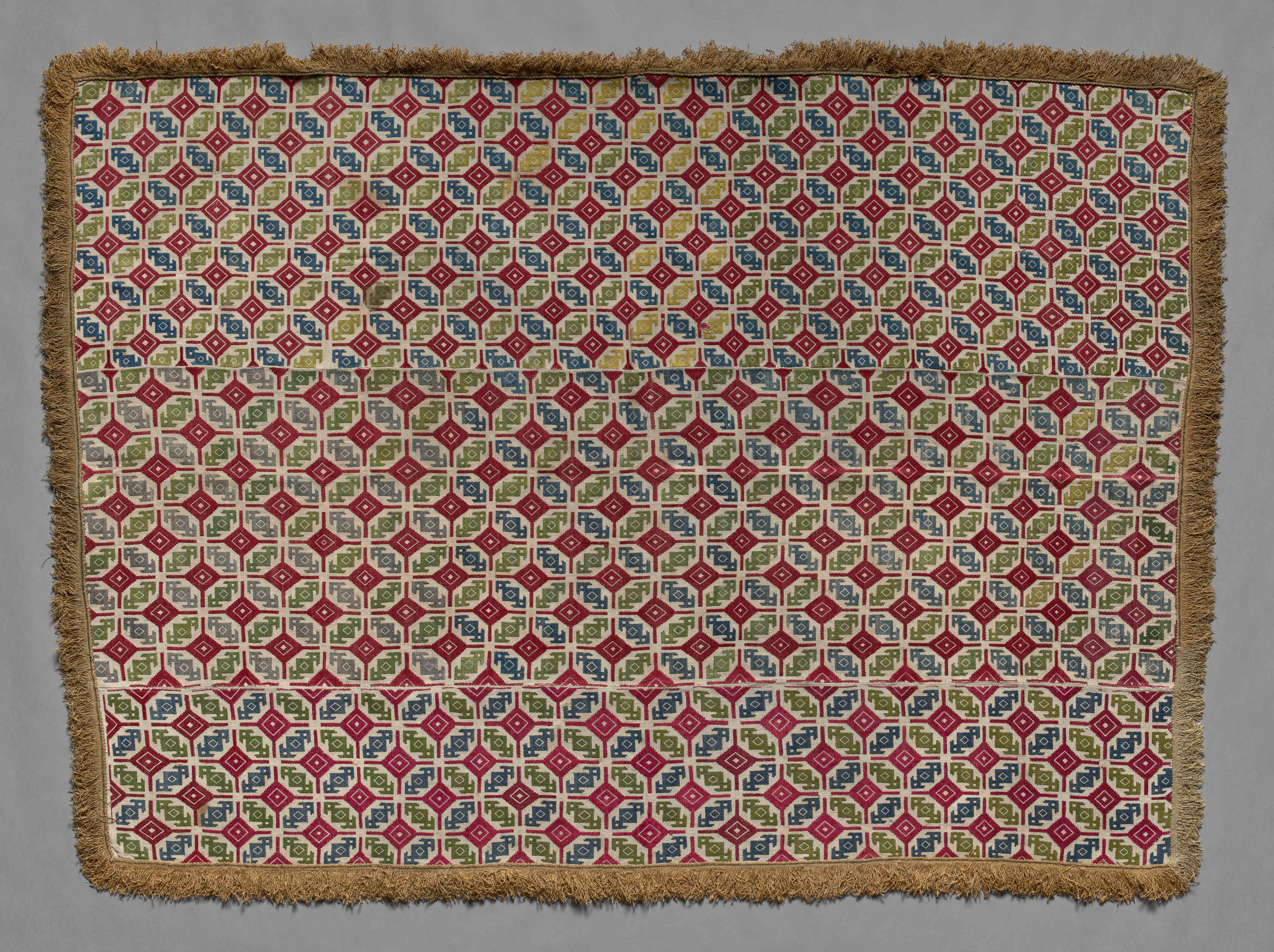 The bedspread "Bedspread" by artist is rectangular with a brown fringe around the edges. The main body of the bedspread features a repeating pattern of small diamonds and flowers in red, blue, green, and beige colors. The diamonds are arranged in rows and columns, with each diamond containing a smaller flower design. The background of the bedspread is beige. The fringe is made up of short, thin threads that are a light brown color. The bedspread fills most of the frame, with a gray background visible around it.
