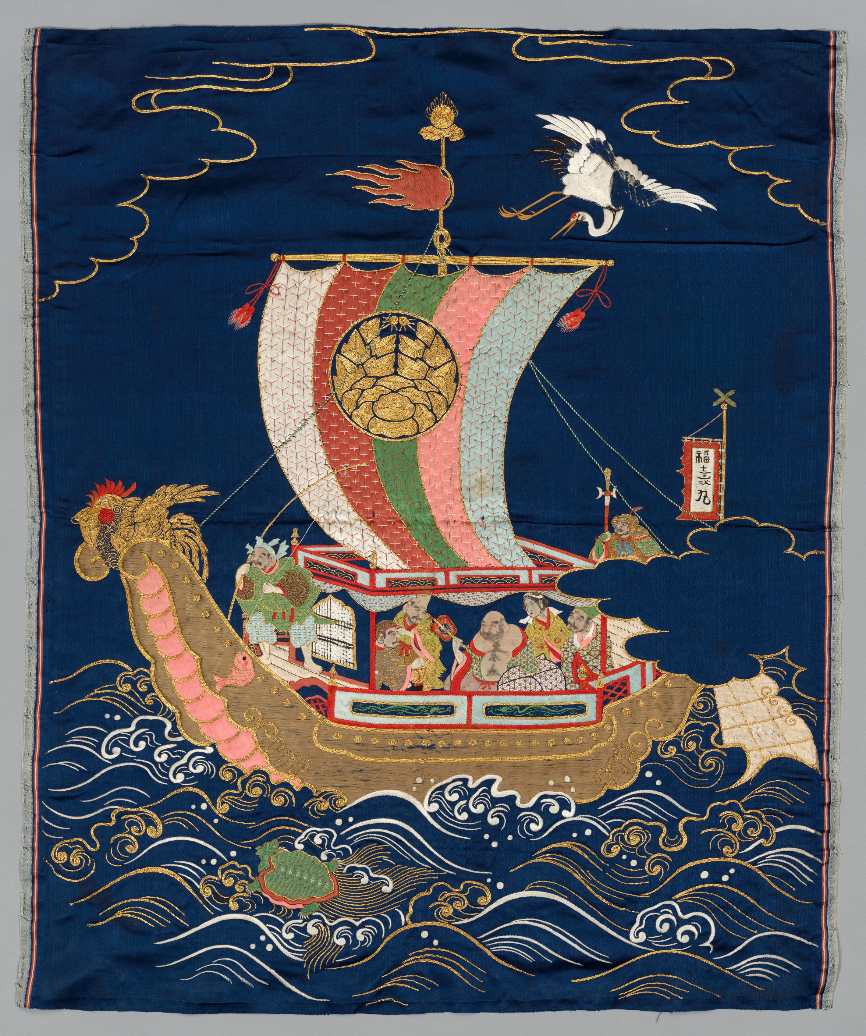 Embroidered Fukusa by an unknown artist. The image depicts a rectangular piece of fabric with a dark blue background and a colorful boat in the center. The boat has a brown hull with pink and gold accents and a large sail with red, white, green, and blue sections. A gold circle with a black design is in the center of the sail. The boat has a dragon's head at the front and people dressed in traditional clothing are on board. A white bird flies above the boat. The water below the boat is dark blue with white and gold waves. Gold clouds are scattered throughout the image. A red and white banner with Japanese characters is attached to the right side of the boat. The fabric has a red and gold border around the edges.