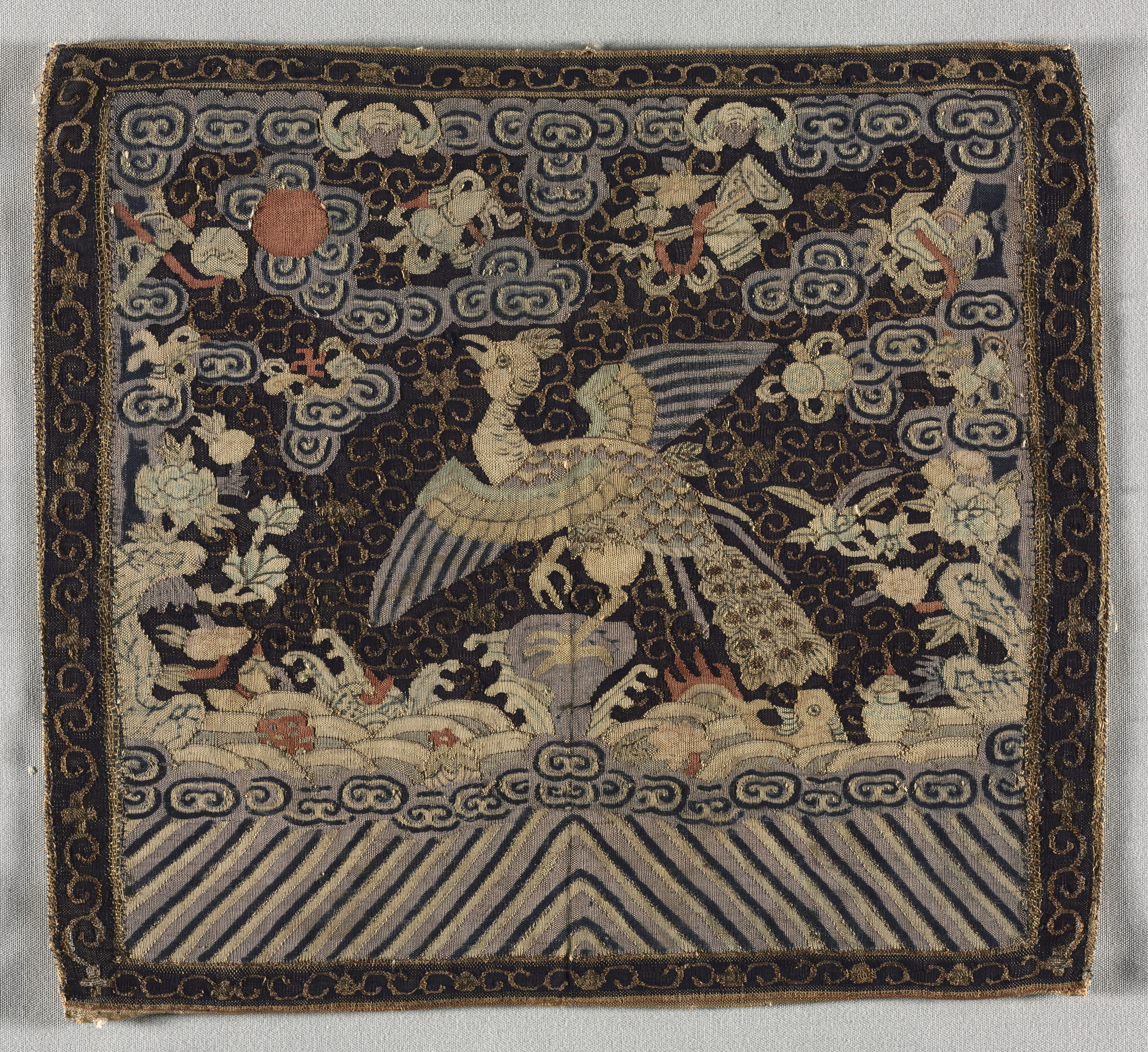 Rank Badge with a crane. The badge is square. The background is black with white clouds. A large white and gray crane with a long neck and tailfeathers stands on a rock mound; it has a red mark on its forehead. The rock mound has a red plant on it. The bird faces left. There are four bats around the bird in the clouds. There is a red sun in the top left corner. The bottom of the badge has a chevron pattern. The border is black with a gold scroll pattern.