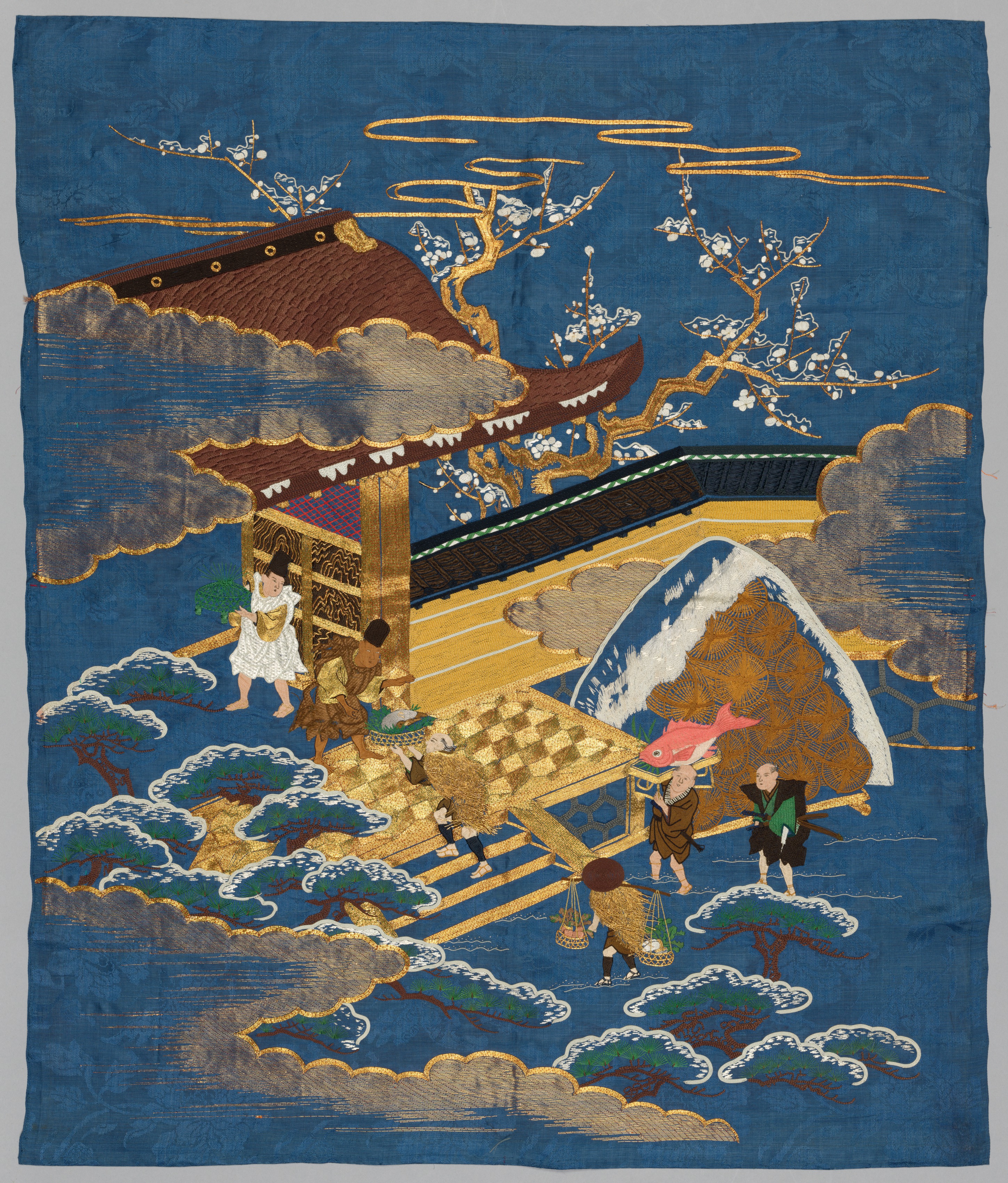 Embroidered Fukusa by artist, rectangular piece of blue fabric with embroidered scene, predominantly gold, brown, white and green colors; depicts a Japanese-style building with brown roof and gold accents; building has a large wave design on the side; five people outside the building, one wearing white, two wearing brown, and two wearing dark and light colored clothing; people are carrying baskets and a large fish; several trees with green leaves and white flowers; clouds are gold and white; background is blue with some gold swirls.