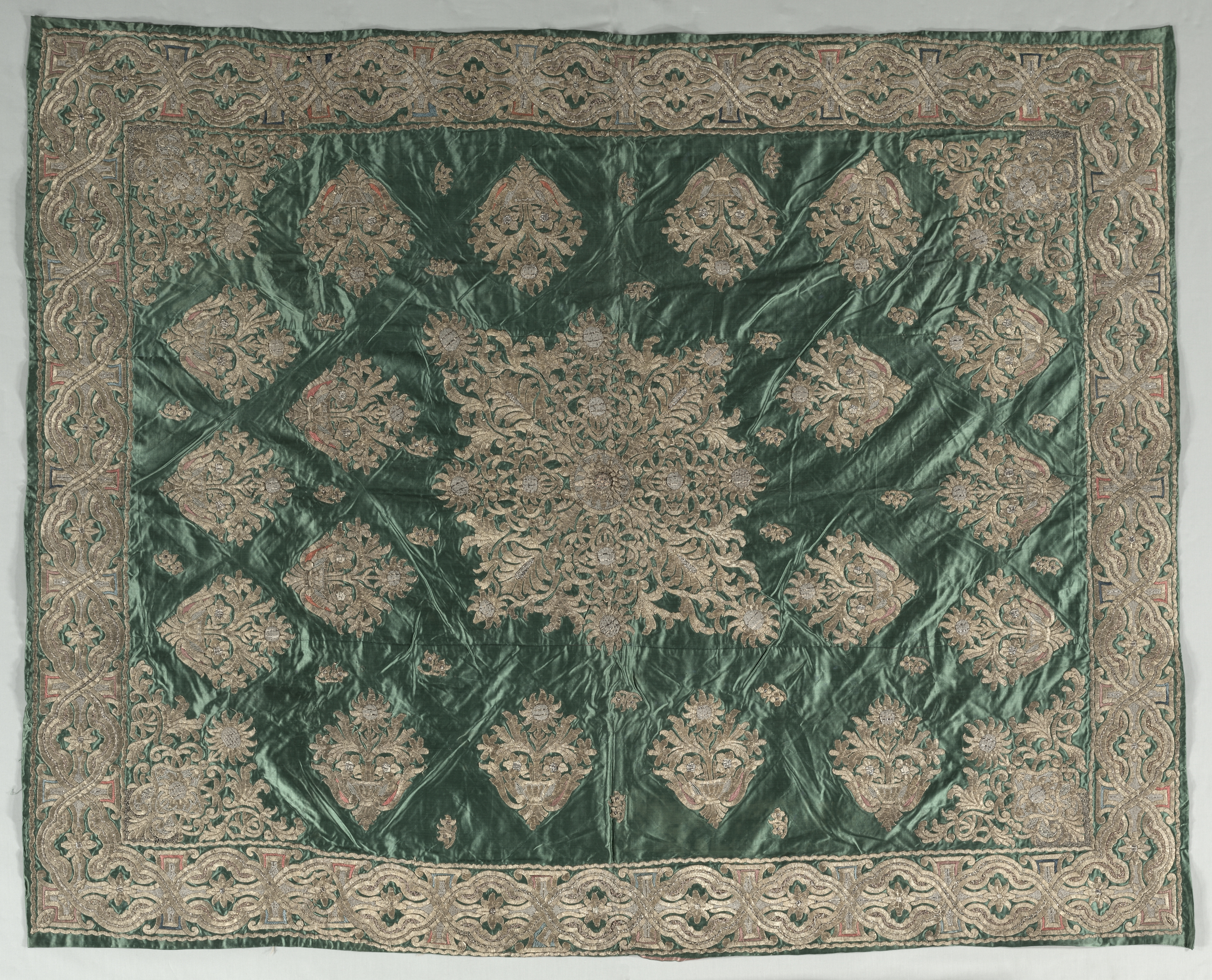 Gold-thread embroidered cover by artist. Dark green square fabric with shiny, slightly wrinkled surface. The fabric is decorated with intricate gold embroidery in a symmetrical floral pattern. The center of the fabric features a dense cluster of floral motifs. The center cluster is surrounded by a series of diamond-shaped sections, each containing a teardrop-shaped floral motif. The border of the fabric features a repeating pattern of curved lines and floral motifs. The outer edge of the fabric has a decorative border with a leaf-like design. The background behind the fabric is plain gray.