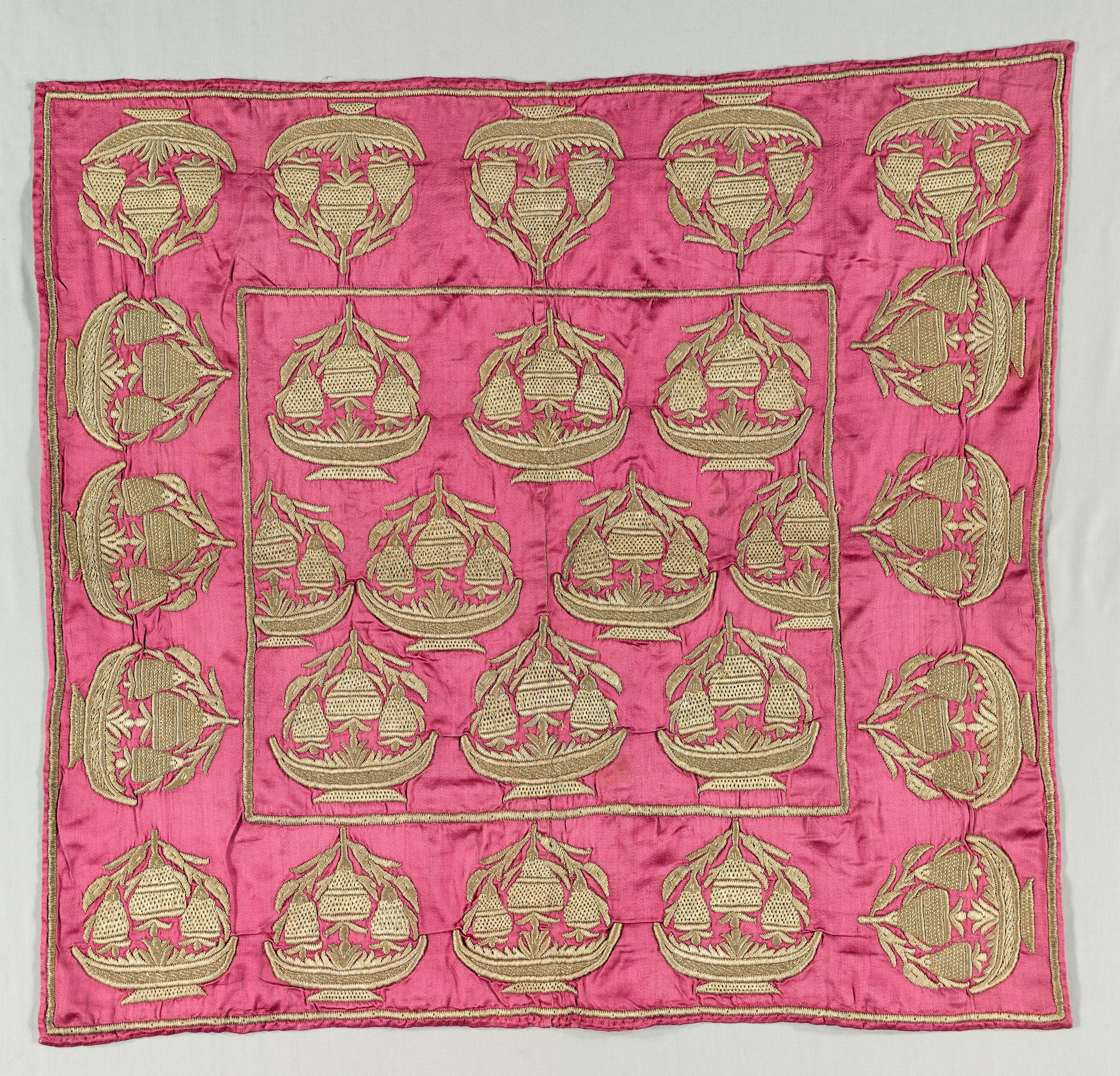 Pink square cloth with a thin gold border, featuring a repeating pattern of 20 gold floral-like designs. The outer border has 12 of these designs along the edges. A smaller, square area in the center contains 8 of the same designs. The gold designs have a central teardrop shape with a curved base and pointed top, surrounded by curved leaves. The background of the cloth is pink fabric. The embroidered square is by artist unknown.