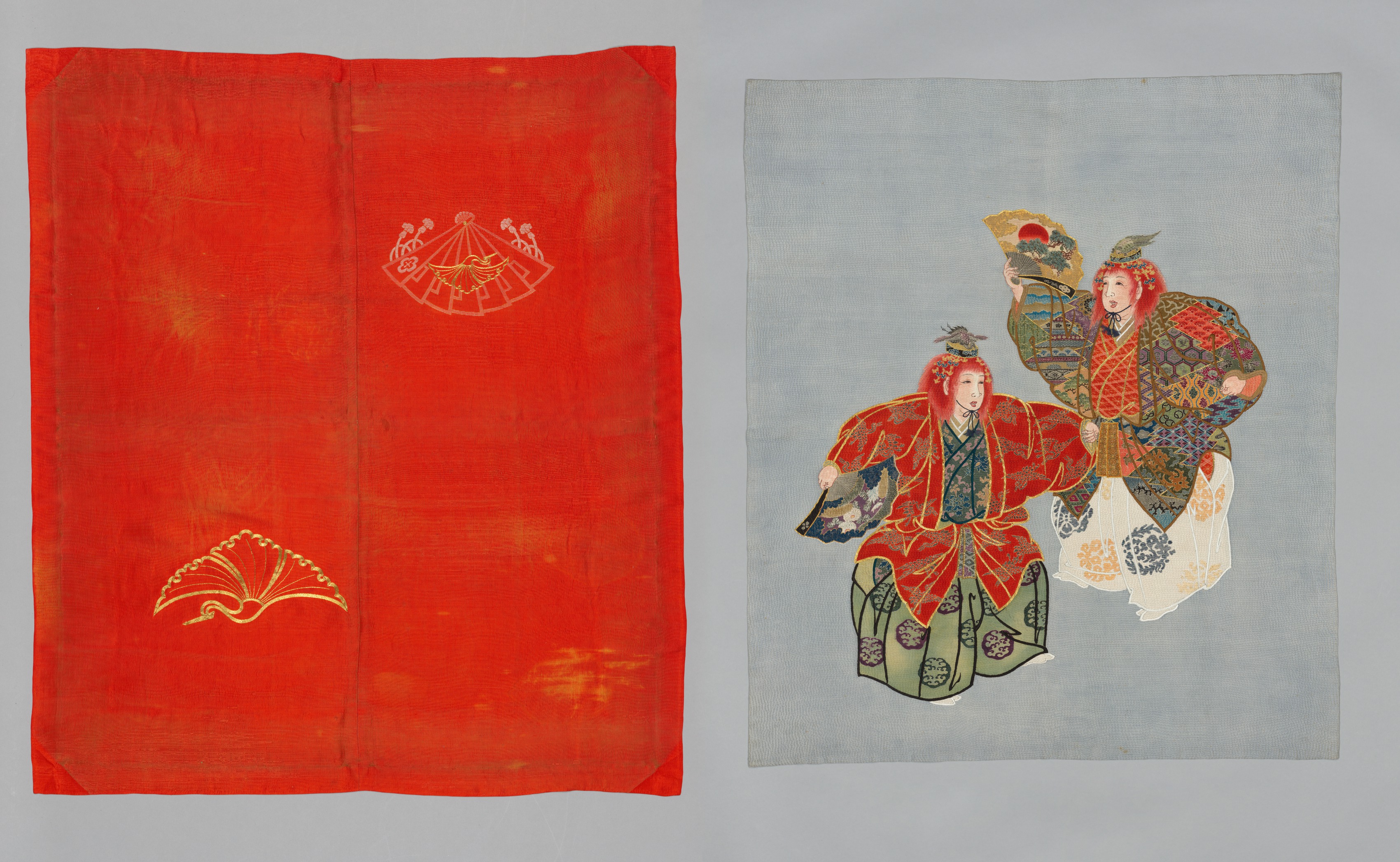 Embroidered and Resist-Dyed Fabric by anonymous. The image features two pieces of fabric side by side. The left fabric is red-orange with two gold embroidered designs: a carousel-like motif at the top center and a fan-like motif at the bottom left. The right fabric depicts two figures in traditional Japanese clothing on a light blue background. The figure on the left is seated and wears a red robe over a blue outfit with a green skirt; they hold an object. The standing figure on the right wears a colorful robe and a headdress, with a white garment over their lower body; they hold a red fan. Both fabrics have visible stitching and texture, suggesting handmade craftsmanship.