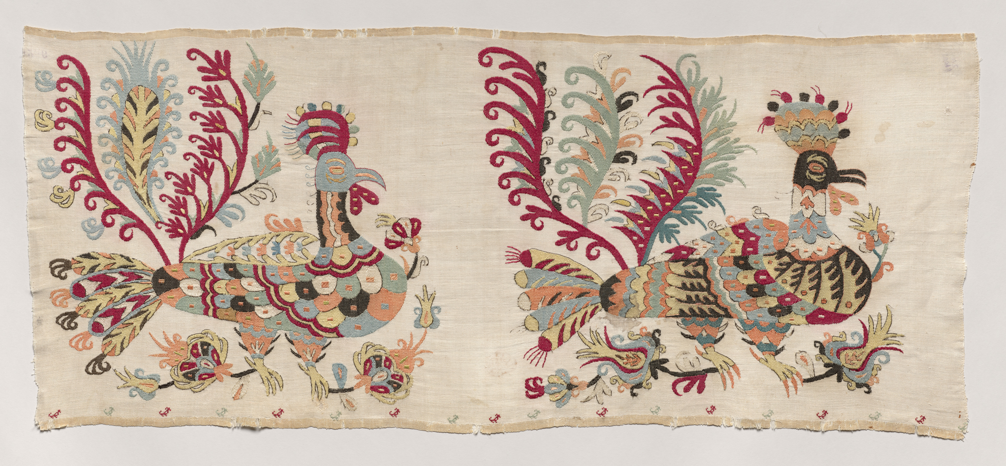 Panel, Probably from a Skirt by Unknown. The item is a rectangular piece of fabric with rough, frayed edges on all sides. The fabric is off-white or beige in color. It features two large birds with intricate designs and patterns, including feathers, leaves, and flowers. The birds are facing each other, with one on the left side and one on the right. The birds have long necks and tails, with the tails extending upwards behind them. The birds are decorated with various colors, including red, orange, blue, black, and yellow. The designs on the fabric include embroidered or appliqué elements. The background of the fabric has small, scattered floral patterns. The overall design is symmetrical, with the two birds mirroring each other. The fabric appears to be made of a lightweight material, possibly silk or cotton. The item is likely a panel from a skirt, as indicated by its shape and design.