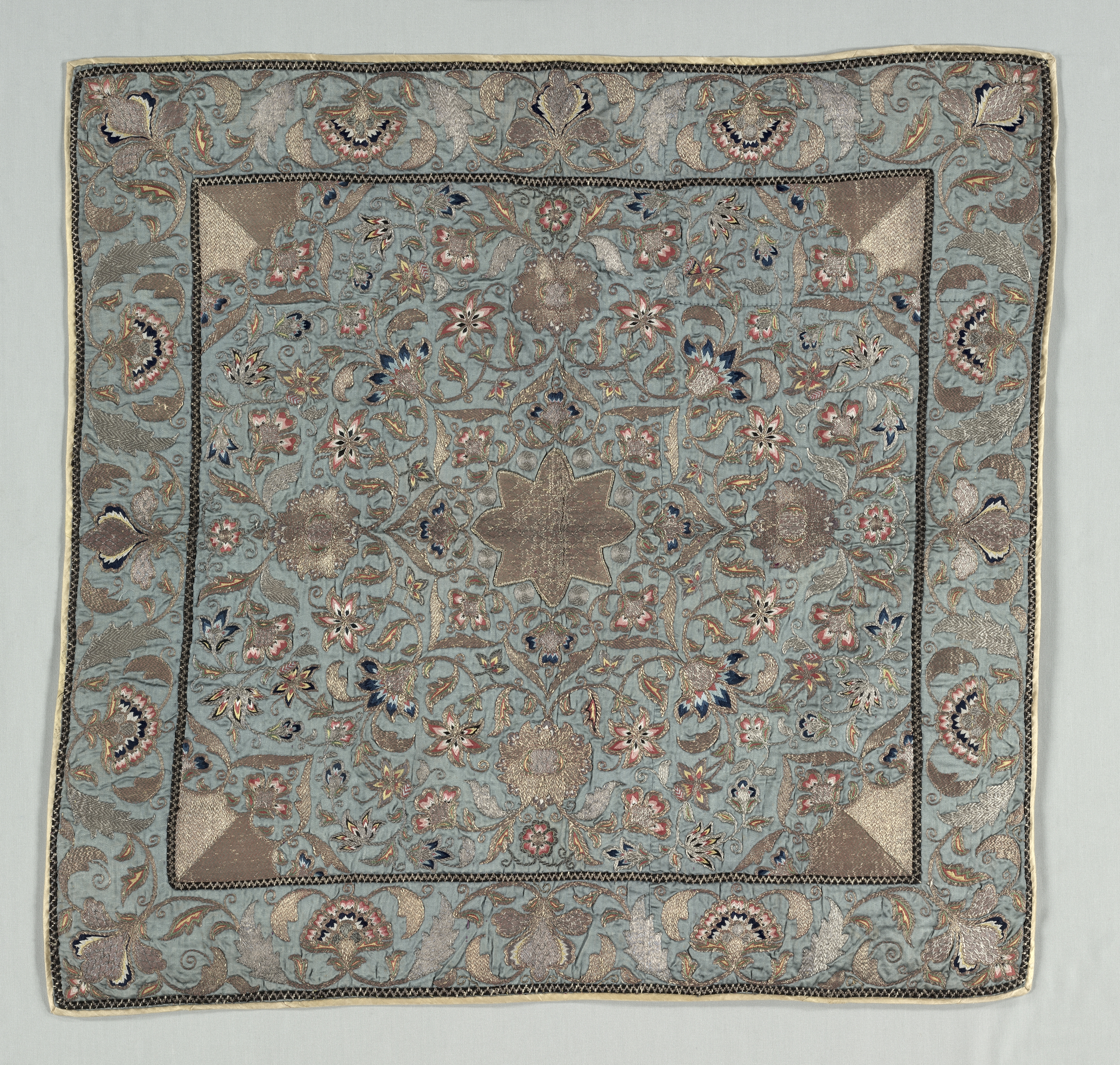 Square embroidered panel by unknown artist titled "Embroidered Panel". The panel is light blue with a central square outlined by a thin black stitched border. The central square features intricate floral designs and patterns in shades of pink, gold, and blue. The outer border also features floral designs and patterns in similar colors. The panel has a wavy edge and is set against a plain gray background.