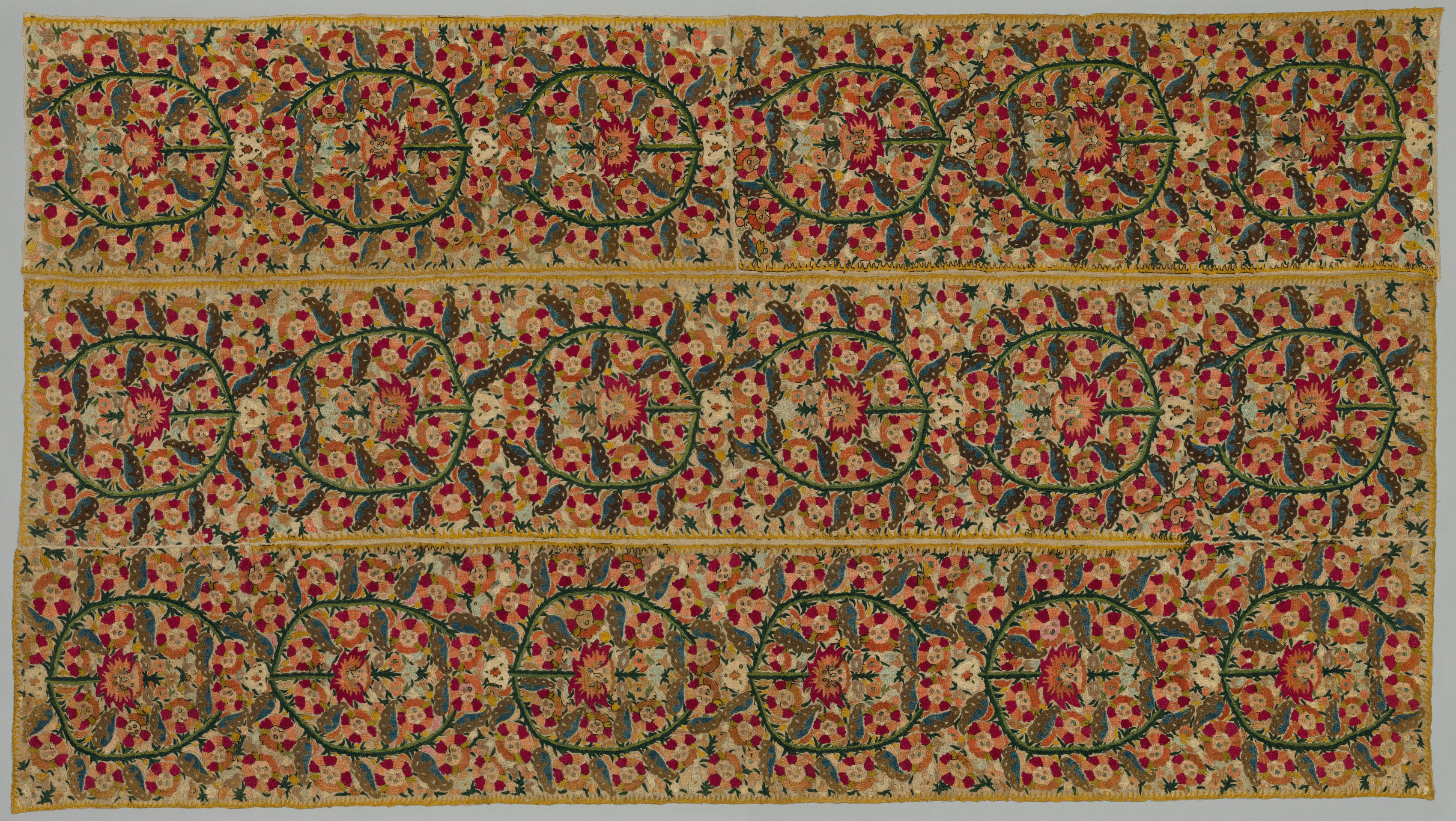 The image shows a rectangular textile with a repeating floral pattern. The textile is divided into three horizontal sections. The background of the textile is yellow-beige. There are green curved lines that form interconnected circles. Inside and around the circles are small flowers and leaves in shades of red, orange, yellow, and green. The flowers have multiple petals and are arranged in a repeating pattern. The leaves are oval-shaped and have pointed tips. The entire textile is bordered by a thin yellow line. The textile appears to be a bedspread, as indicated by the title "Four Borders from a Bedspread". The style of the textile suggests it may be the work of an unknown artist.
