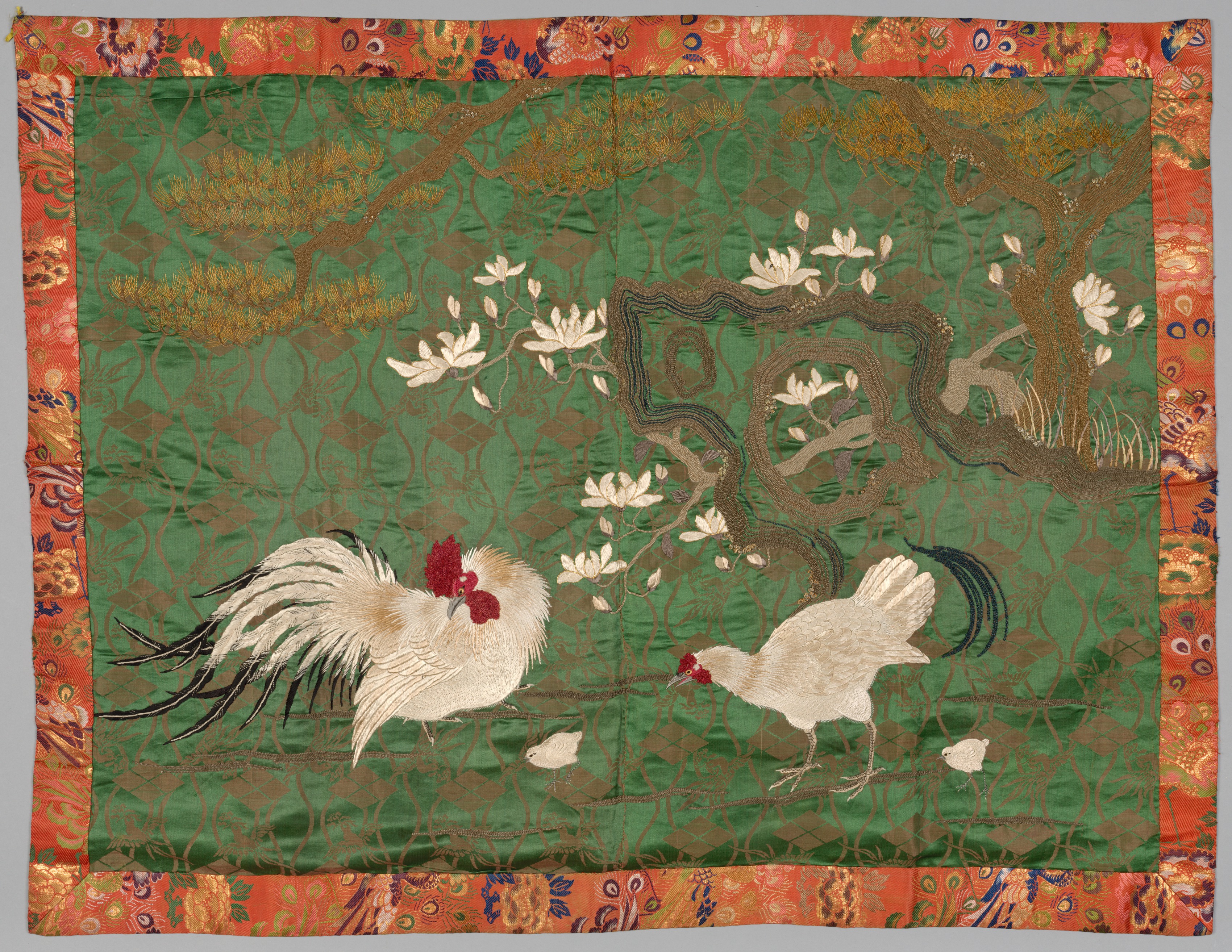 Embroidered Fukusa by artist. Green fabric with brown embroidered vines and white flowers. Two white chickens with red combs and black tails on green ground, surrounded by three smaller white birds. Border of orange fabric with floral pattern.
