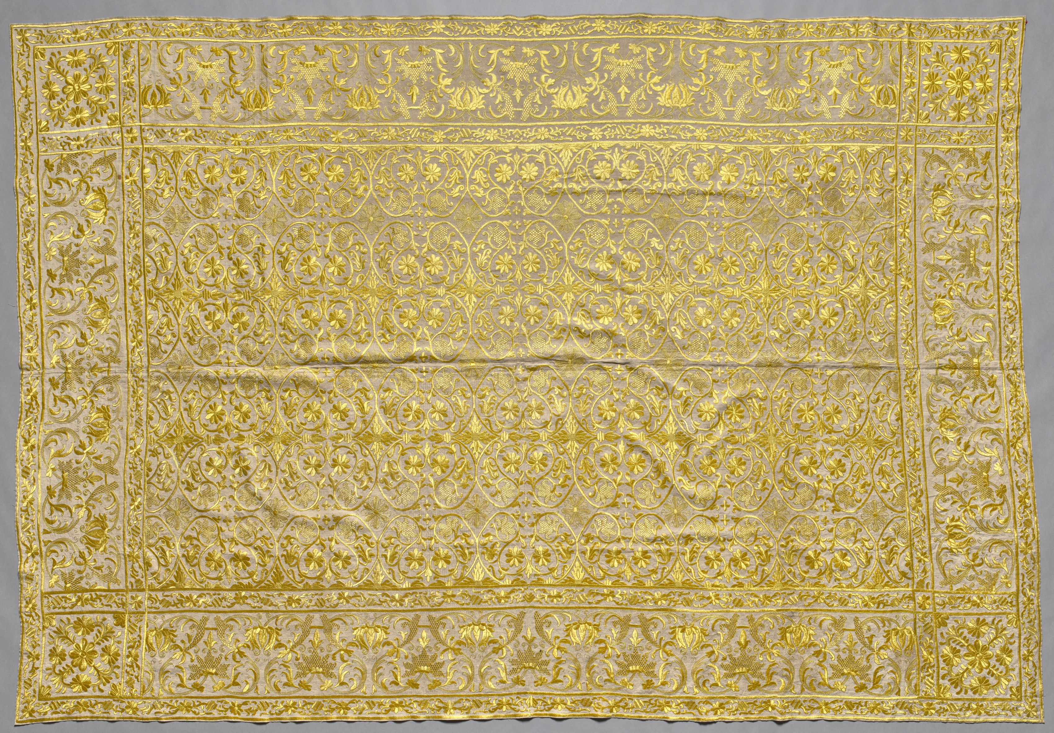 The image shows a gold embroidered bedspread. The rectangular bedspread fills the frame. The bedspread's background color is light beige or off-white. The entire bedspread, including its border, is densely embroidered with gold thread in intricate floral patterns. The outer border of the bedspread consists of repeating floral motifs. Inside the outer border, there are four corner sections with floral motifs that match the outer border. Inside those corner sections, there are three horizontal rows of identical floral motifs. The central area of the bedspread consists of a large rectangle with a floral pattern that matches the border and corner sections. The bedspread appears to be made of a thin, possibly silk or cotton, fabric. The background behind the bedspread is gray.