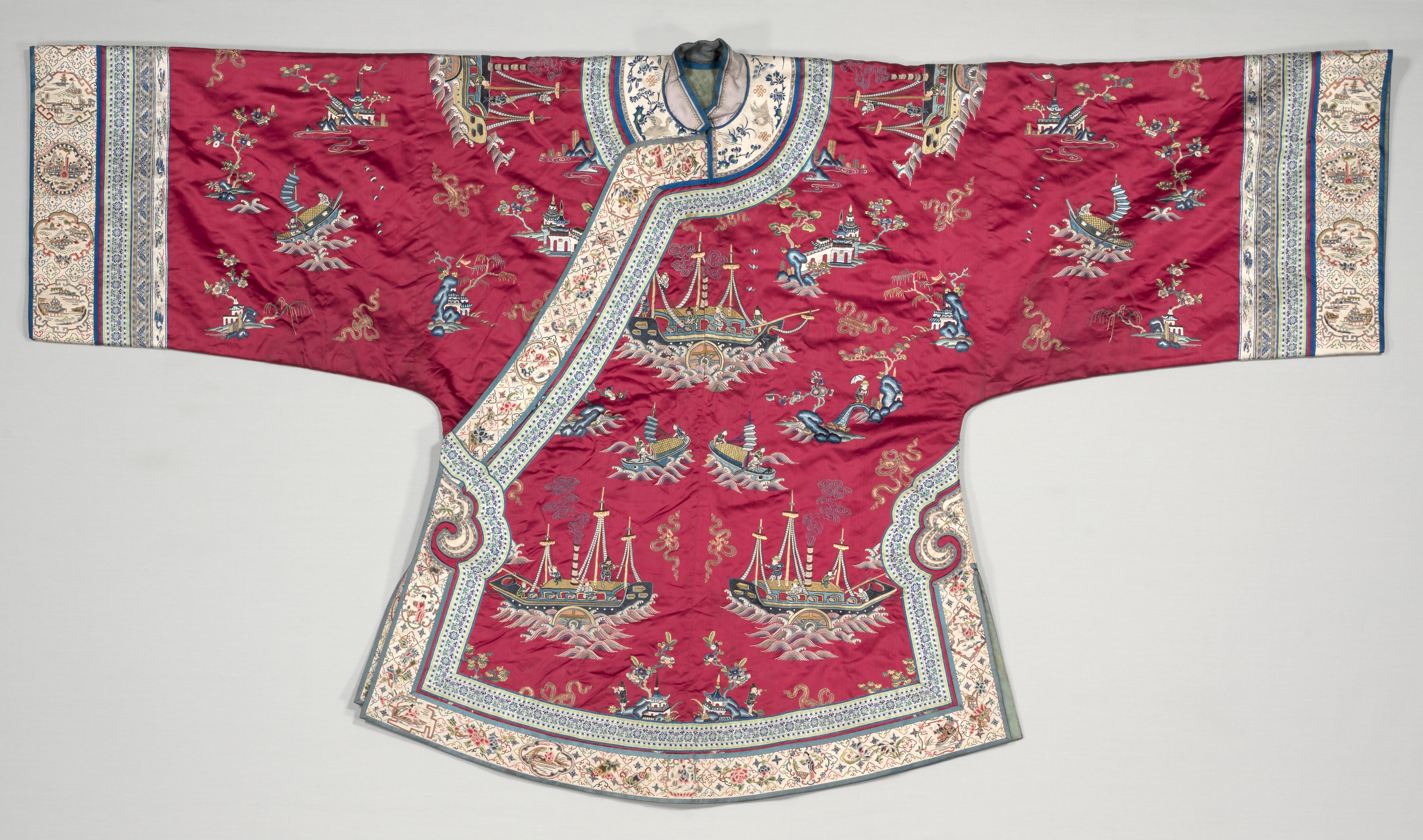 The coat is red with wide, short sleeves and a short hem that curves outward. A vertical line with a white, blue and gold pattern runs down the center. The coat has a Mandarin collar. The coat features a repeating pattern of ships, buildings, people, and foliage in shades of blue, gold, white, and gray. A wide white, blue, and gold border runs along the hem and sleeves. The border features a design with roundels at the top and bottom of the sleeves. The coat appears to be made of silk and has a traditional Asian design, specifically Chinese, and is likely a cheongsam or changshan. The artist of the coat is unknown but it is titled "Coat".