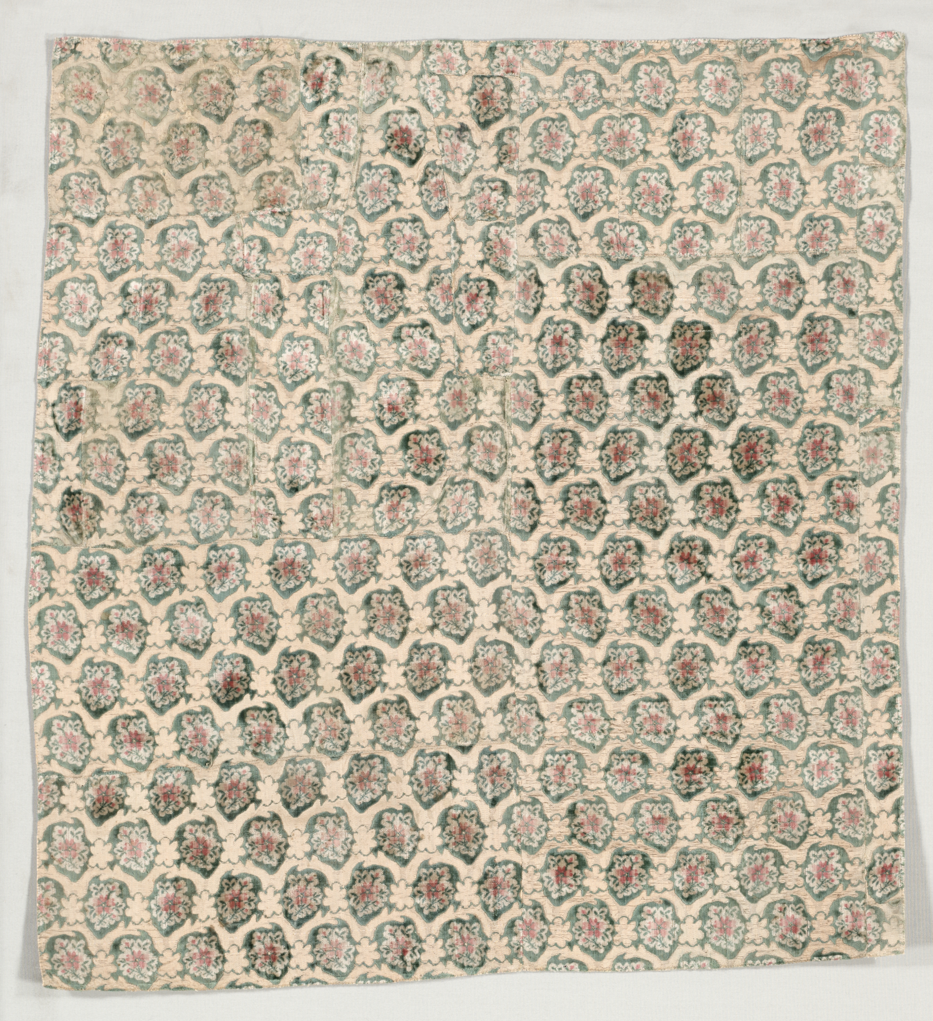 The image shows a square piece of velvet fabric with a repeating pattern. The fabric is beige with a repeating design of four-leaf shapes, each containing a floral pattern. The four-leaf shapes are outlined in green and contain a pink and white flower in the center. The background of the fabric is beige. The fabric is laid flat on a white surface. The title of the image is "Velvet Segment".