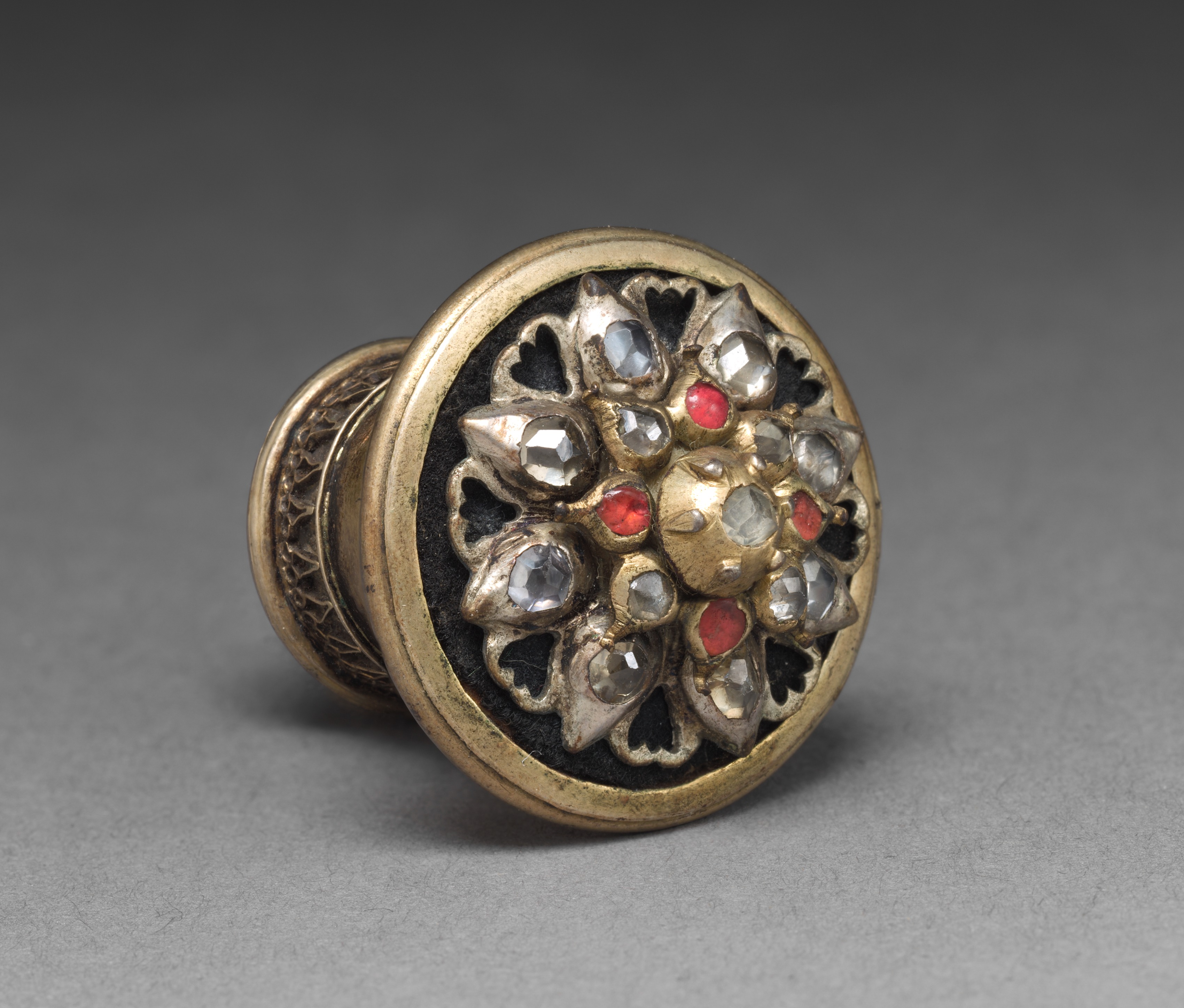 Round, gold-colored metal object with a flat top and a cylindrical base. The top has a flower-like design with a central circle surrounded by eight petal-like shapes. The petals and center are adorned with clear and red gemstones. The top and bottom edges have a raised rim. The cylindrical base has an etched pattern around it. The background is a gray surface with a darker gray gradient at the top. The object titled "Ear Stud" by the artist.