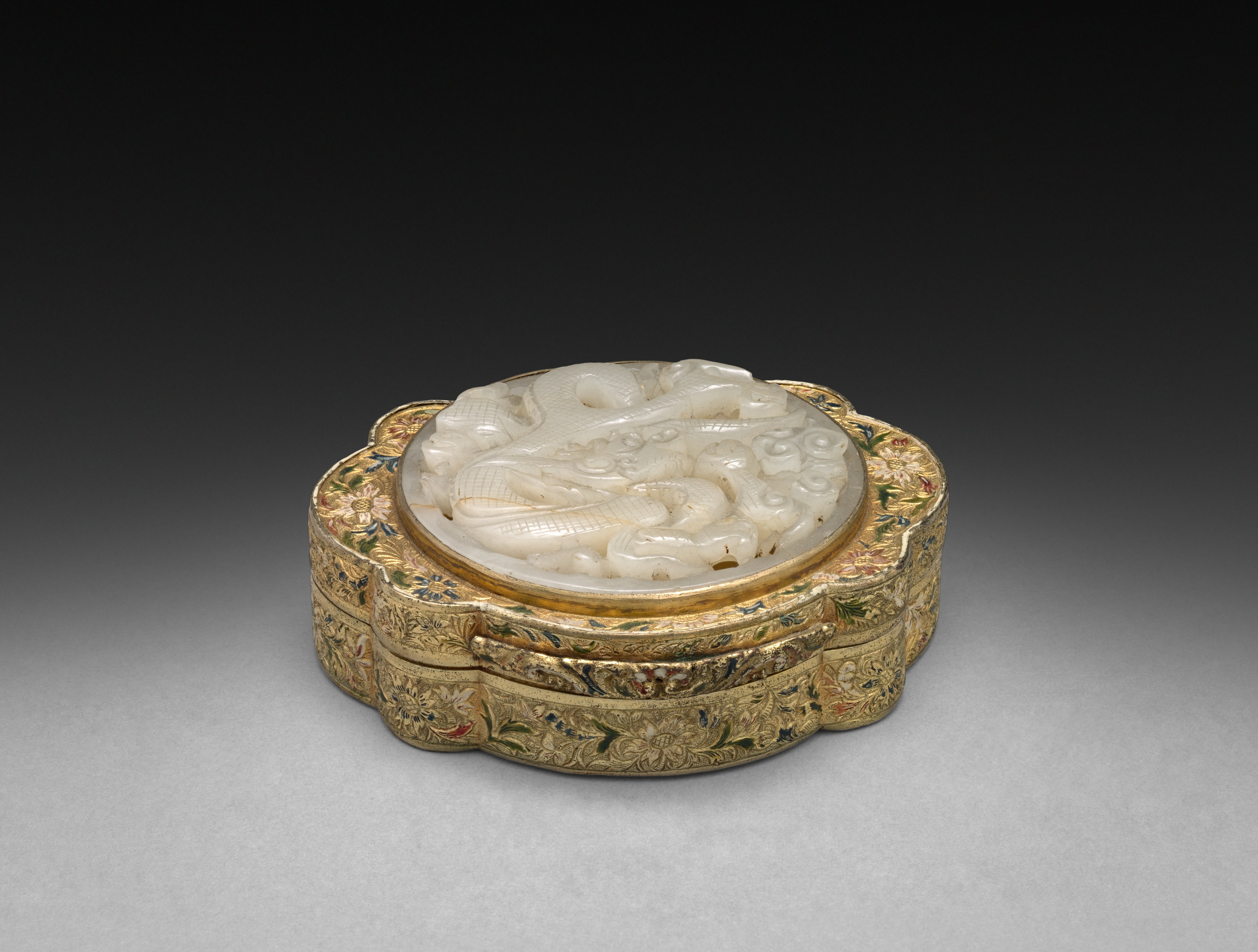 Round, gold-colored box with a lid. The box has a scalloped edge and is decorated with intricate designs and patterns in gold, green, blue, and red. The lid is circular and flat, featuring a white jade carving of a scene with dragons. The box appears to be made of metal, possibly gold or brass, and has a lid that fits on top of it. It sits on a gray surface against a black background. The artwork is titled "Box" by an unknown artist.