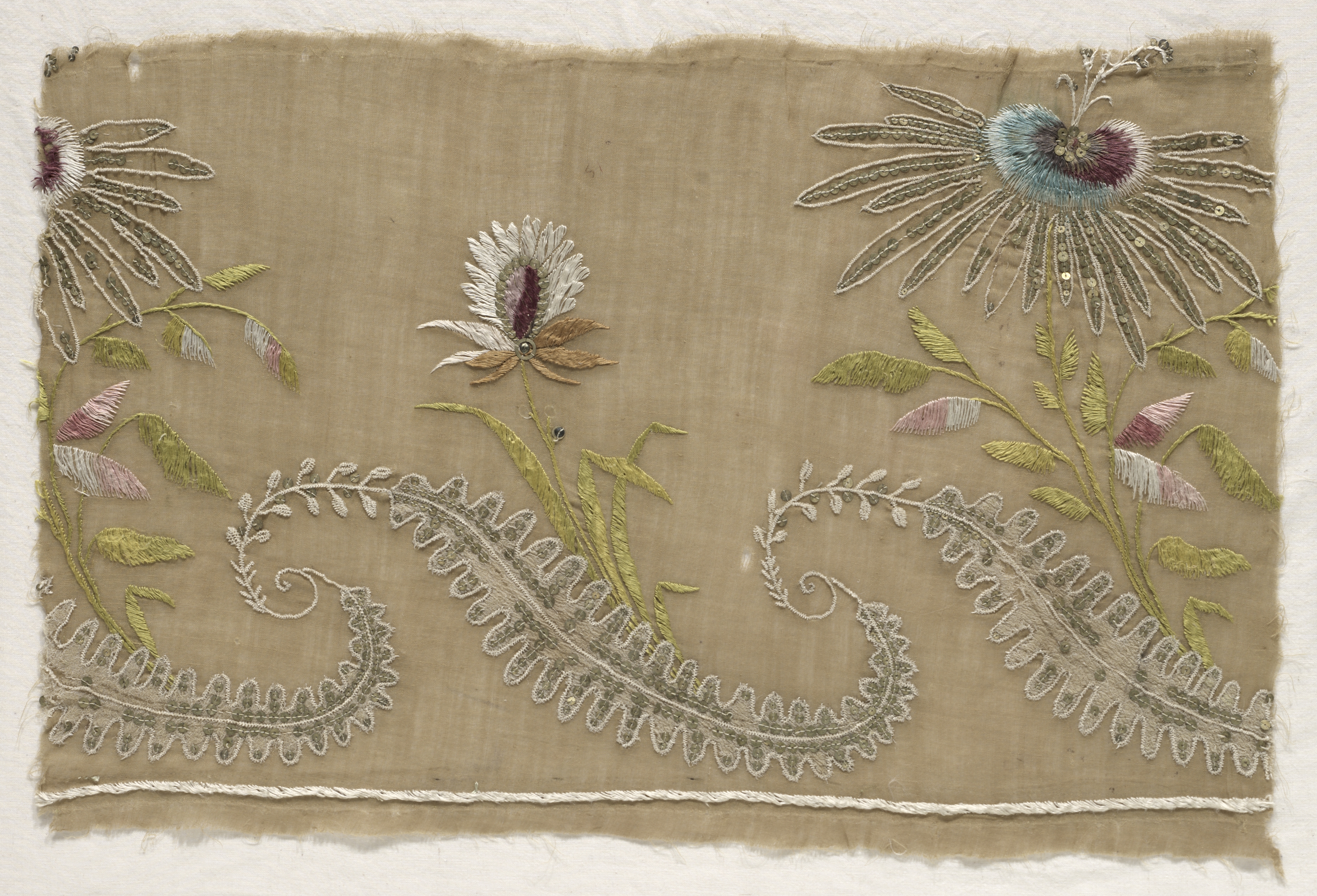 Tan fabric with frayed edges, featuring embroidered flowers and leaves in shades of green, pink, white, blue, and purple. The flowers have long, thin petals and are accompanied by stems and leaves. A wavy line of white embroidery runs along the bottom. A single white rope-like line is embroidered near the bottom edge. The fabric is set against a white background. Fragment of Embroidery.