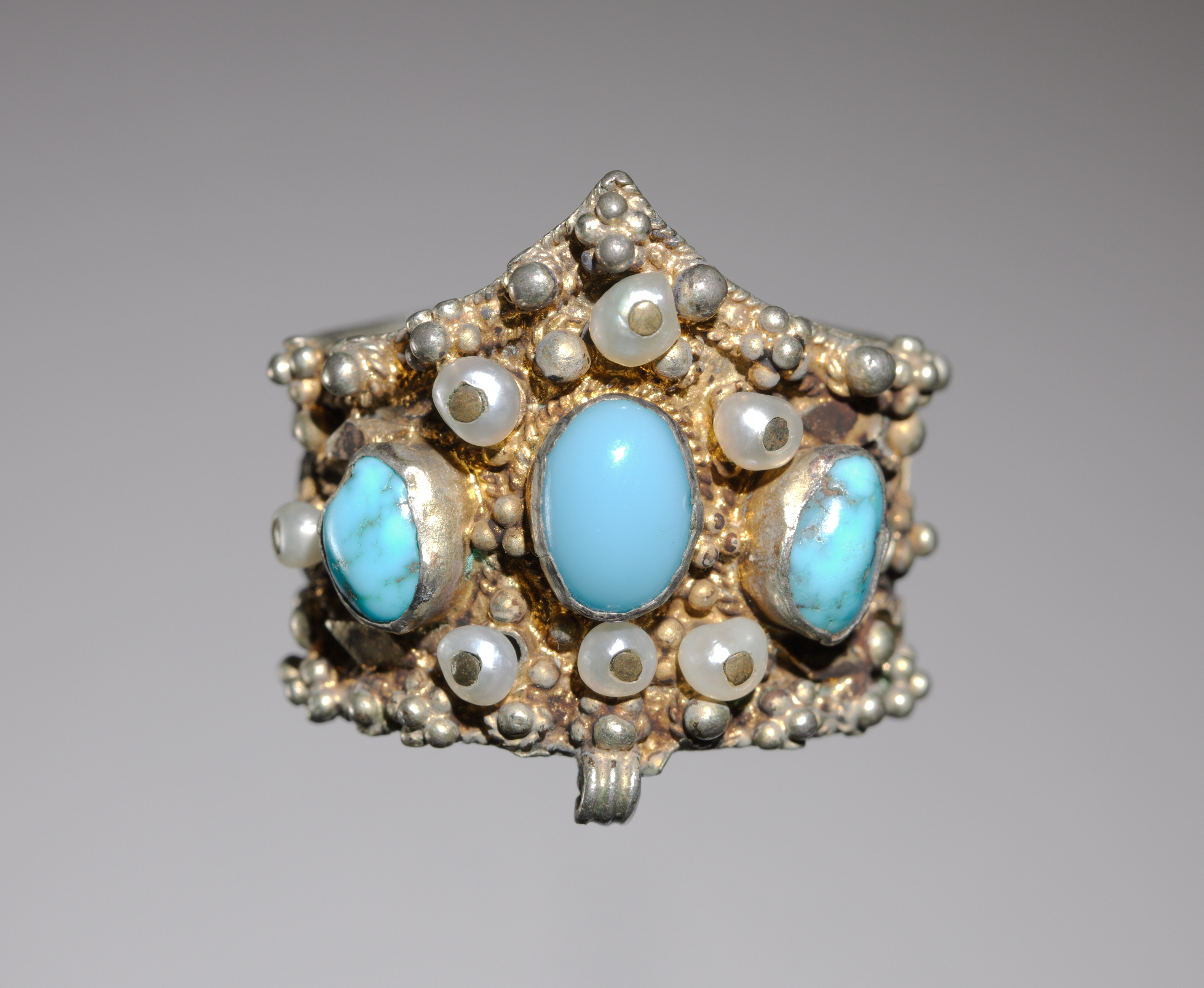 Gold-colored cuff bracelet with a textured surface. Three oval turquoise stones set in a row. The left and right stones are smaller and have darker veins. The middle stone is larger and lighter. Small white pearls and gold beads around the stones. Small gold loop at the bottom center. Gray background. Title: Ring. Artist: unknown.