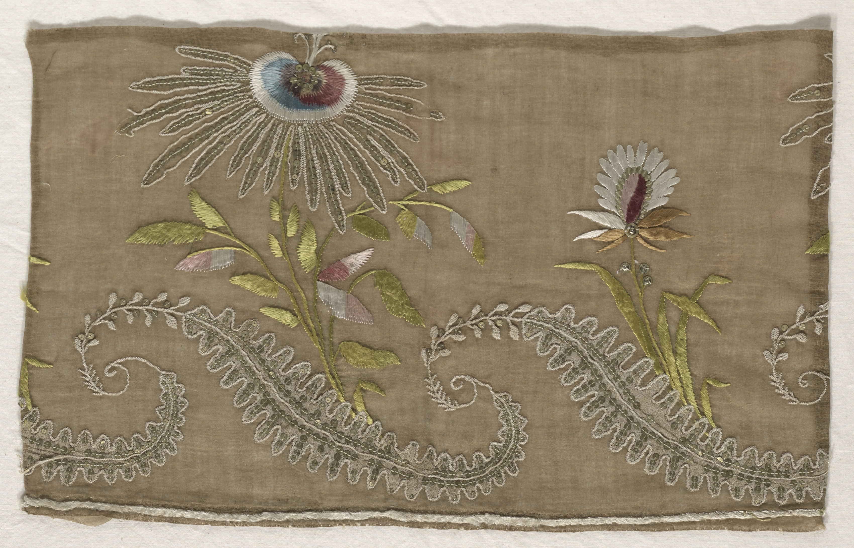 Brown fabric with frayed edges, having a central large flower with white, blue and red center and white radiating lines; green stem and leaves; and white curved vine line below; a smaller flower to the right with white and red center and white radiating lines; green stem and leaves; and white curved vine line below; beige background. Fragment of Embroidery.