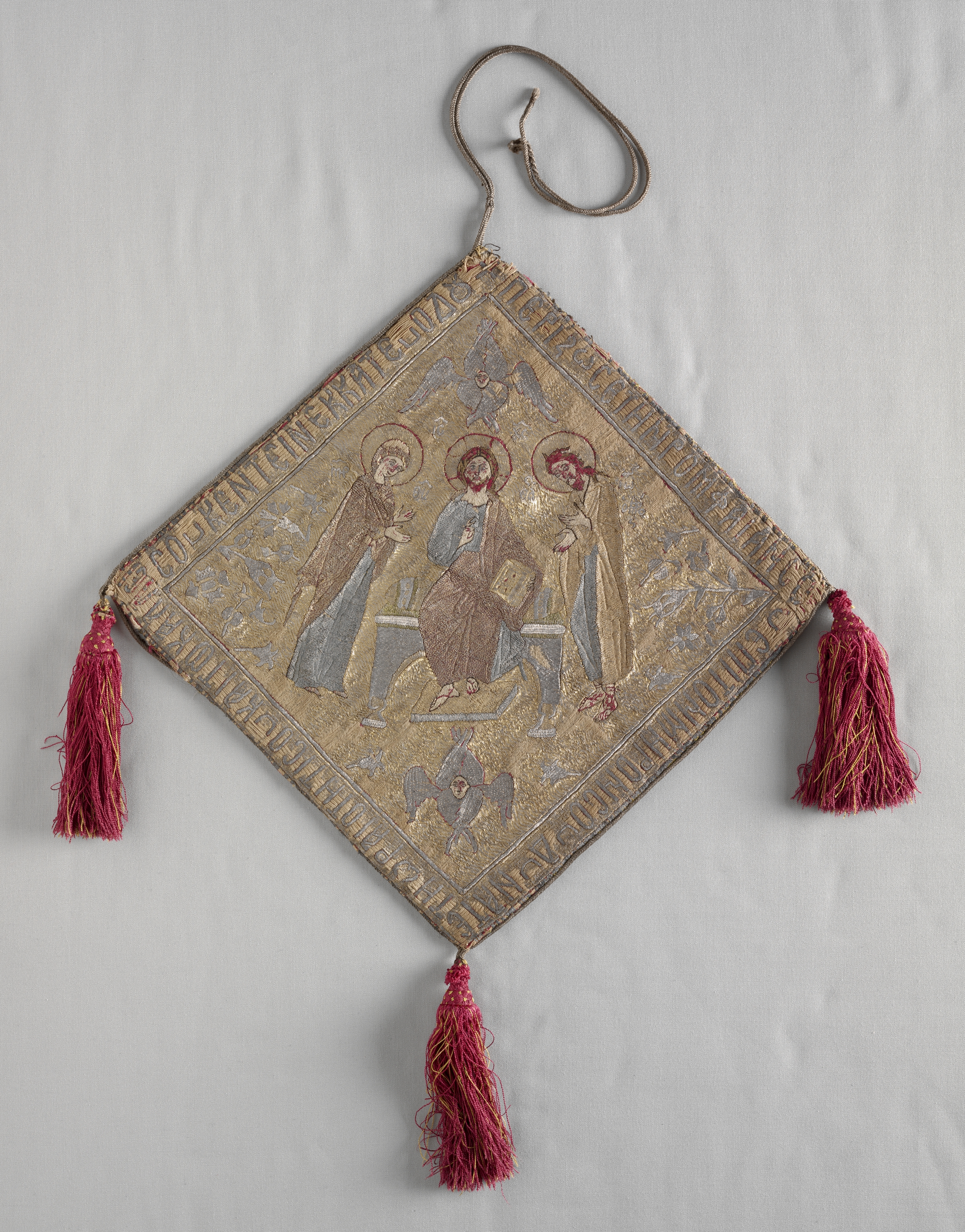 Ecclesiastical Embroidery (Epigonation) by Unknown Artist. The image shows a square piece of fabric with a depiction of three figures in the center. The fabric is beige with a border around the edges. The three central figures are wearing robes and halos, and appear to be saints or religious figures. There are red tassels hanging from each corner of the fabric, and a loop of cord at the top. The background of the image is a light gray color.