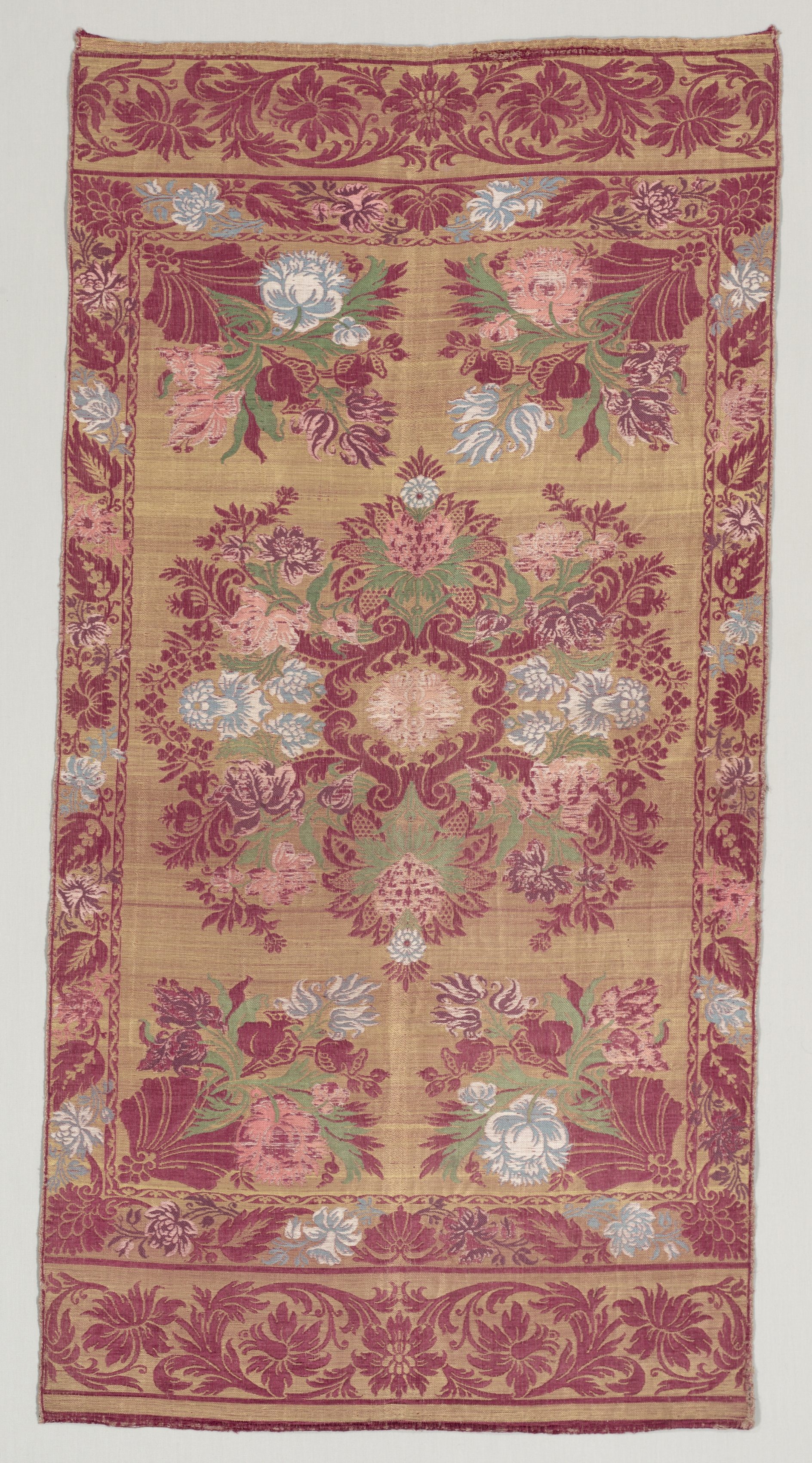 Tan-colored fabric with a rectangular shape and frayed edges. The fabric features a floral design with pink, red, white, and green colors. A red floral border surrounds the fabric on all sides. The border consists of two rows of floral patterns. The main body of the fabric has a symmetrical floral pattern with a central design and four sections of floral motifs, each with a similar arrangement of pink, red, white, and green colors. The background of the main body is tan with horizontal lines.